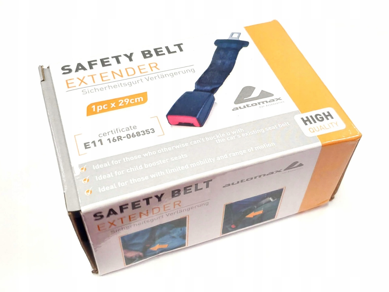 Przedłużacz pasów bezpieczeństwa o długości 29cm. Włóż przedłużacz do pasu bezpieczeństwa, a następnie wsuń przedłużony pas do gniazda stałego pojazdu. Certyfikat E11 16R-068353.