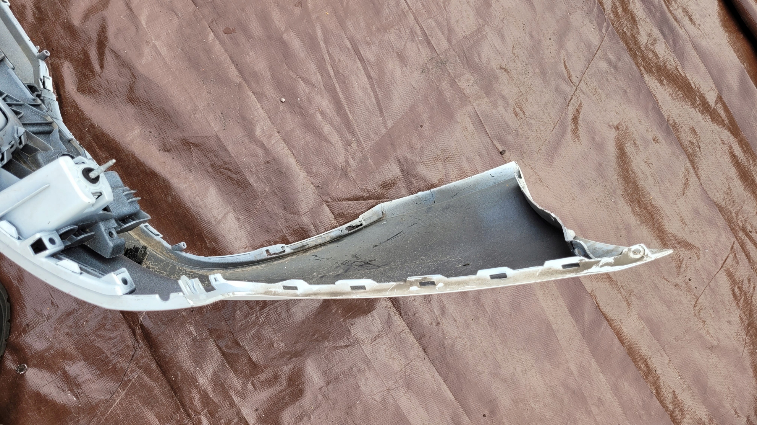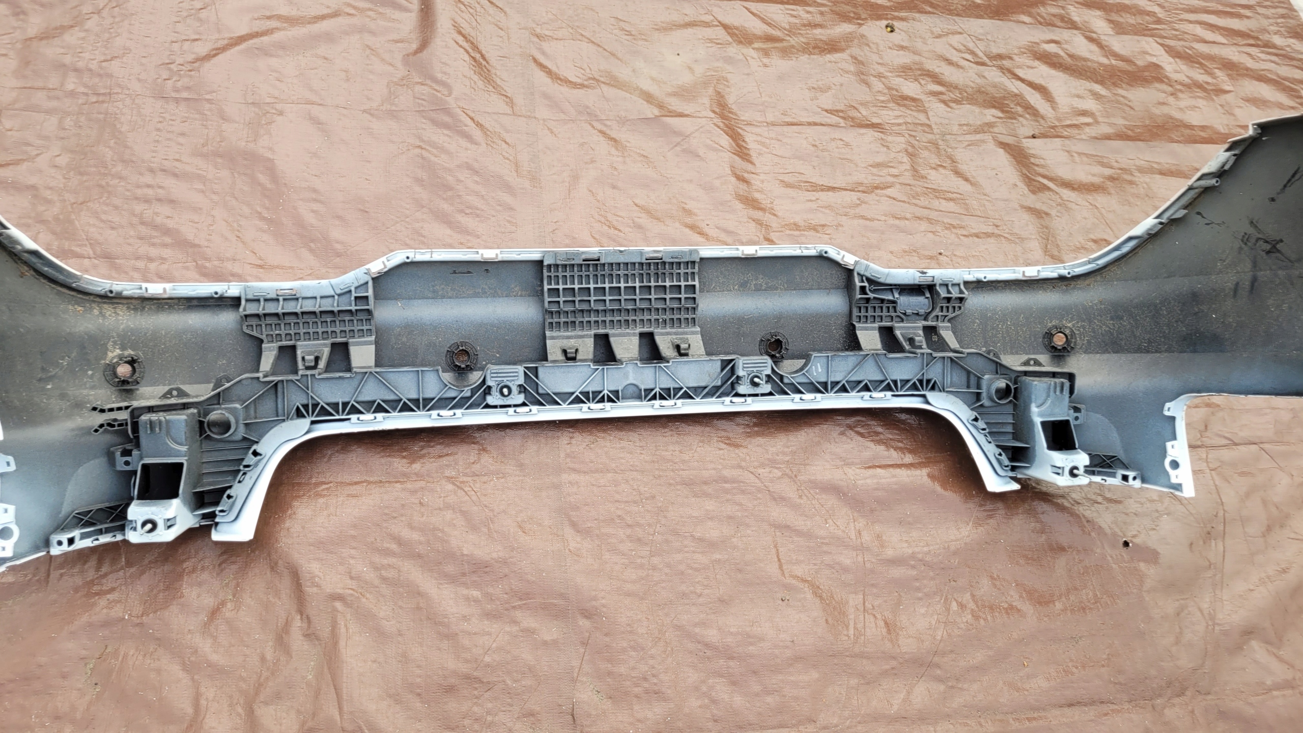 Używany oryginalny zderzak w dobrym stanie, jak na zdjęciach, lekko pofalowany w zaznaczonych miejscach. Zaczepy całe.
