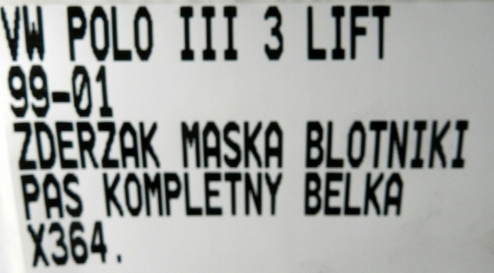| Каталожный номер запчасти: | MASKA ZDERZAK PRZÓD KOMPLETNY WZMOCNIENIE VW POLO III LIFT 99-01 |