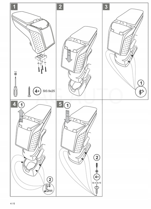 Montaż podłokietnika jest bardzo prosta i nie ma potrzeby odwiedzić serwis samochodowy. Instrukcja obsługi i wkręty do montażu znajdują się w zestawie. Część dolna podłokietnika – adapter, który przykręca się do tunelu środkowego, wykonany jest pod kształt konkretnego modelu auta, dlatego zawsze doskonale pasuje. Nie jest to uniwersalny adapter!