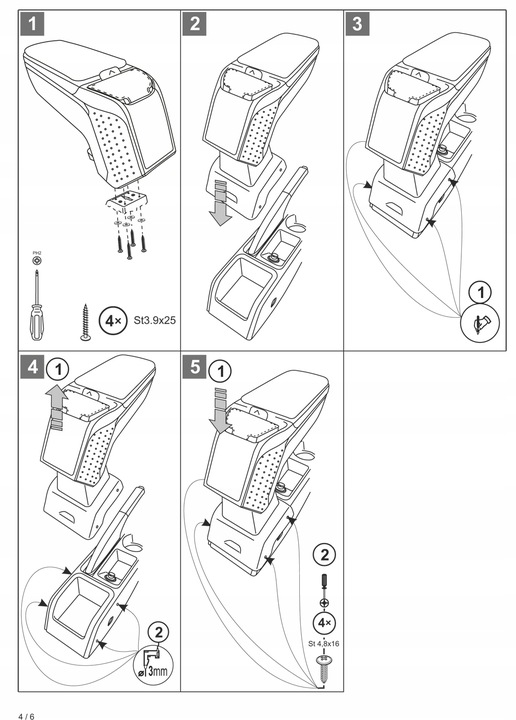 Montaż podłokietnika jest bardzo prosta i nie ma potrzeby odwiedzić serwis samochodowy. Instrukcja obsługi i wkręty do montażu znajdują się w zestawie. Część dolna podłokietnika – adapter, który przykręca się do tunelu środkowego, wykonany jest pod kształt konkretnego modelu auta, dlatego zawsze doskonale pasuje. Nie jest to uniwersalny adapter!