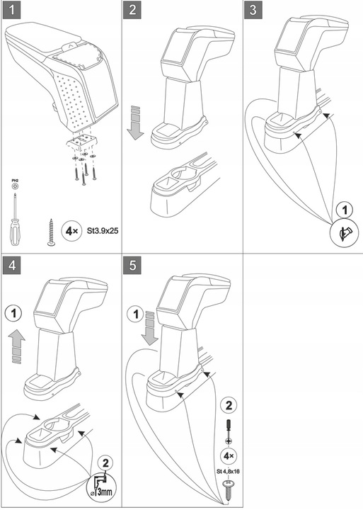 Montaż podłokietnika jest bardzo prosta i nie ma potrzeby odwiedzić serwis samochodowy. Instrukcja obsługi i wkręty do montażu znajdują się w zestawie. Część dolna podłokietnika – adapter, który przykręca się do tunelu środkowego, wykonany jest pod kształt konkretnego modelu auta, dlatego zawsze doskonale pasuje. Nie jest to uniwersalny adapter!