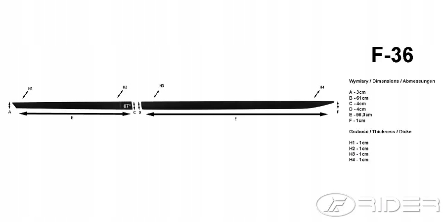 Samochodowe listwy boczne RIDER bardzo dobrze zabezpieczają drzwi samochodu oraz ich przetłoczenia przed obiciami i zarysowaniami mogącymi powstać podczas parkowania w ciasnych przestrzeniach. Listwy montowane są bez ingerencji w nadwozie samochodu. Montaż odbywa się za pomocą taśmy samoprzylepnej 3M fabrycznie zaaplikowanej na powierzchnię listew.
