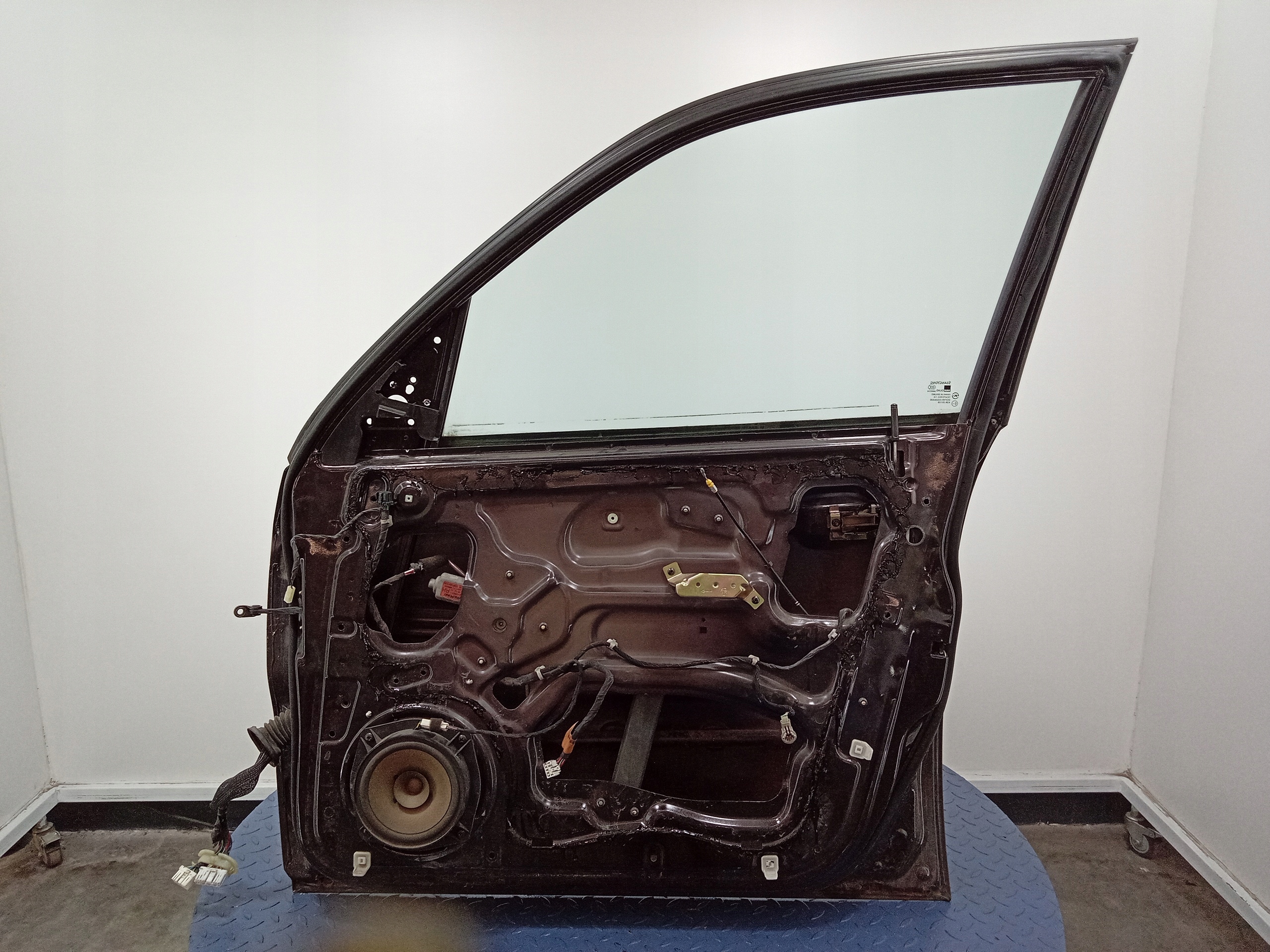 Opis: z klamka zewnętrzną, z instalacją elektryczną, z silniczkiem szyby z głośnikiem, z zamkiem, z szybą, kod koloru WAB, grubość lakieru 270-740mm, widoczne ślady poprzedniej naprawy, uszkodzenia widoczne na zdjęciach, zarysowania, popękania listwy ozdobnej, oznaki korozji widoczne na dolnym rancie, -jakość B && SSANGYONG REXTON I Y200 DRZWI PRZÓD PRAWE
