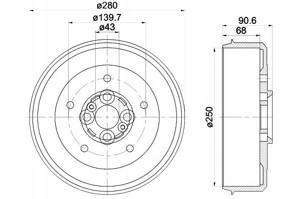 - Średnica bębna hamulcowego: 250
