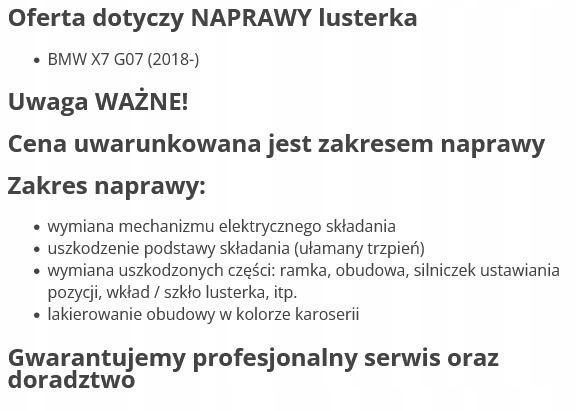 Каталожный номер запчасти: | BMW X7 G07 NAPRAWA LUSTERKA |