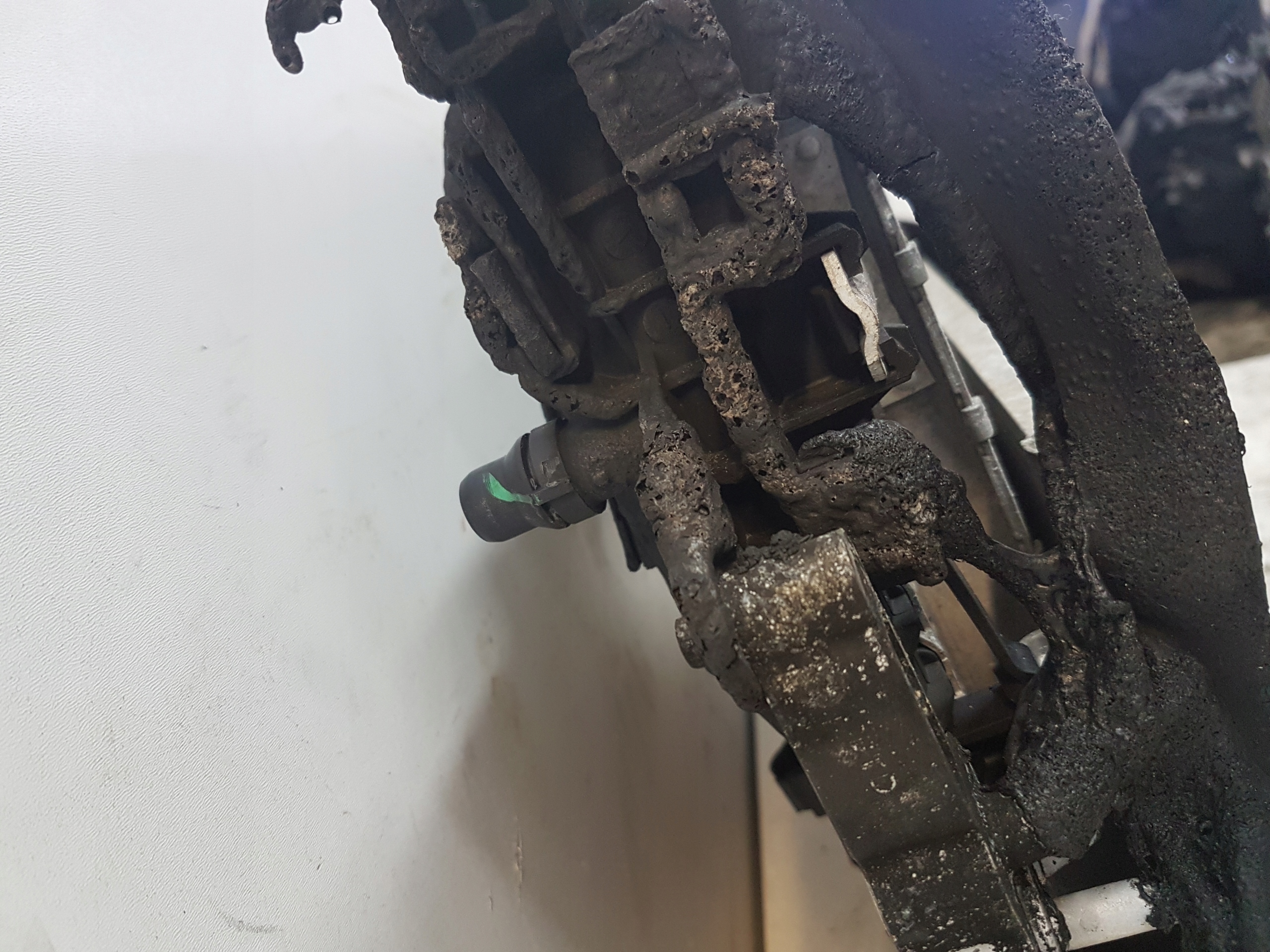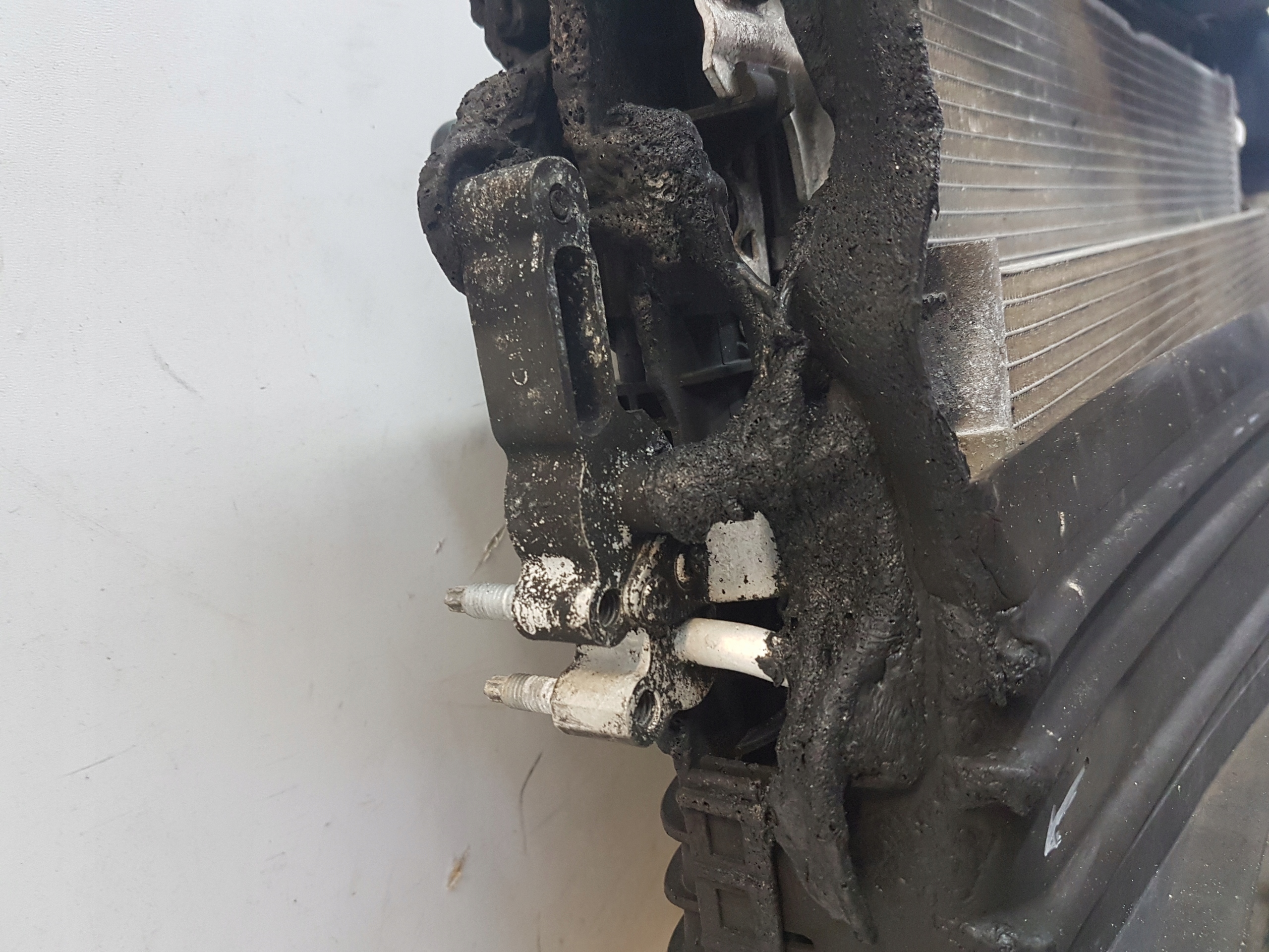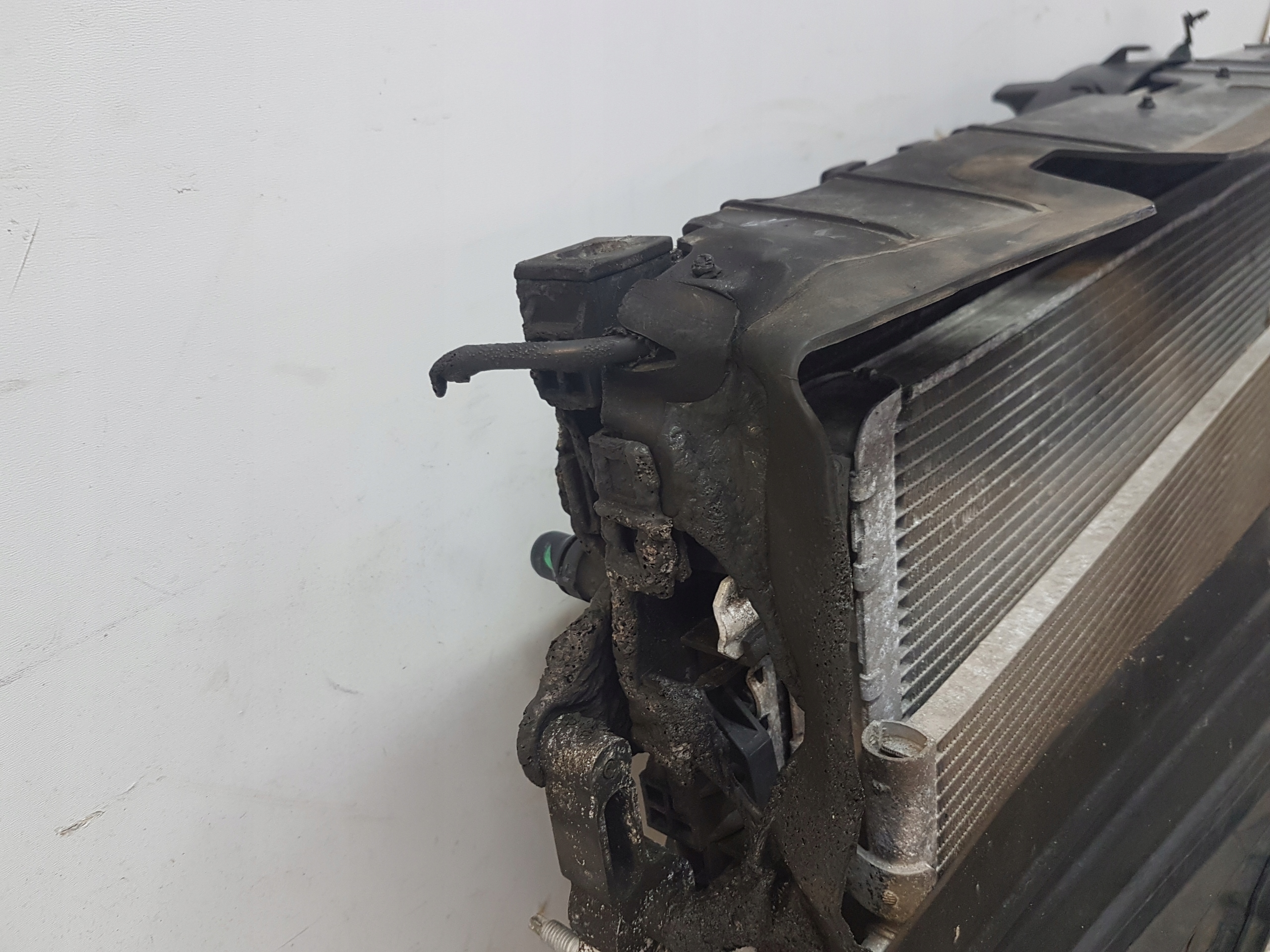Zestaw chłodnic z wentylatorem. Upalony z prawej strony. Chłodnice szczelne