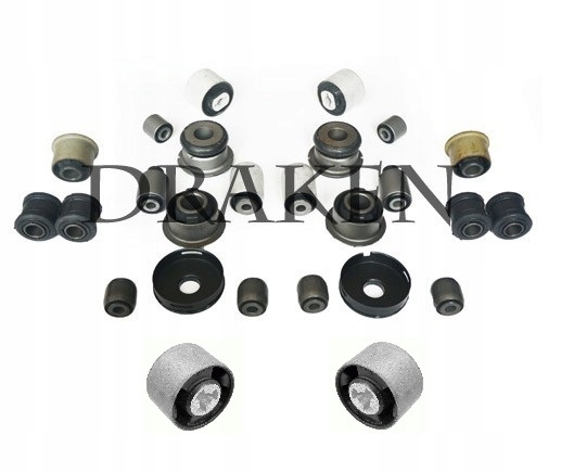 Zestaw obejmuje wszystkie tuleje wahaczy i ramy oraz tuleje mostu/dyfferencjału, łącznie 24 tuleje.