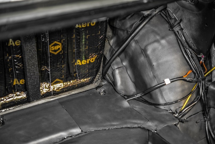 - Maty butylowe naklejamy na niedużą zakładkę. Omijamy miejsca montażowe na śruby, a wiązki elektryczne wyciągamy na zewnątrz.