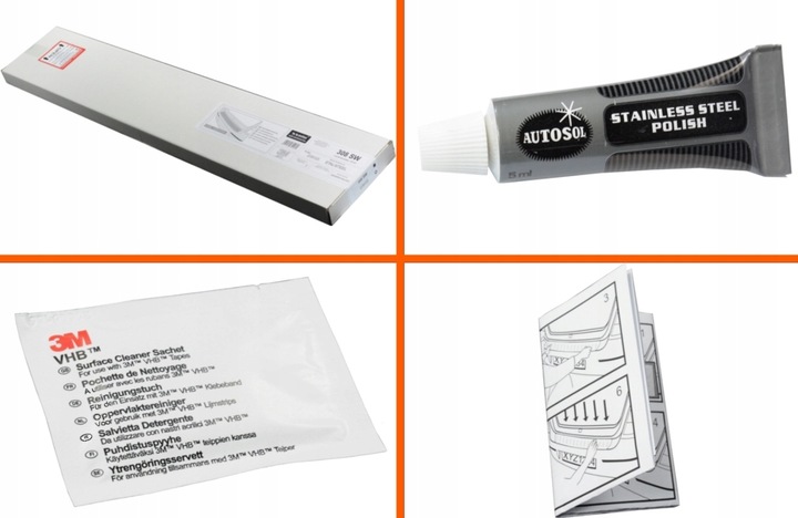 Nakładkę otrzymasz w solidnym opakowaniu wraz z instrukcją montażu krok po kroku oraz chusteczką odtłuszczającą firmy 3M. Do zamówienia dołączamy, również tubkę preparatu Autosol (5 ml) – polerowanie i renowacja stali nierdzewnej. Doskonała formuła preparatu zapewnia powierzchni stali trwały połysk bez zarysowań oraz solidną warstwę ochronną.