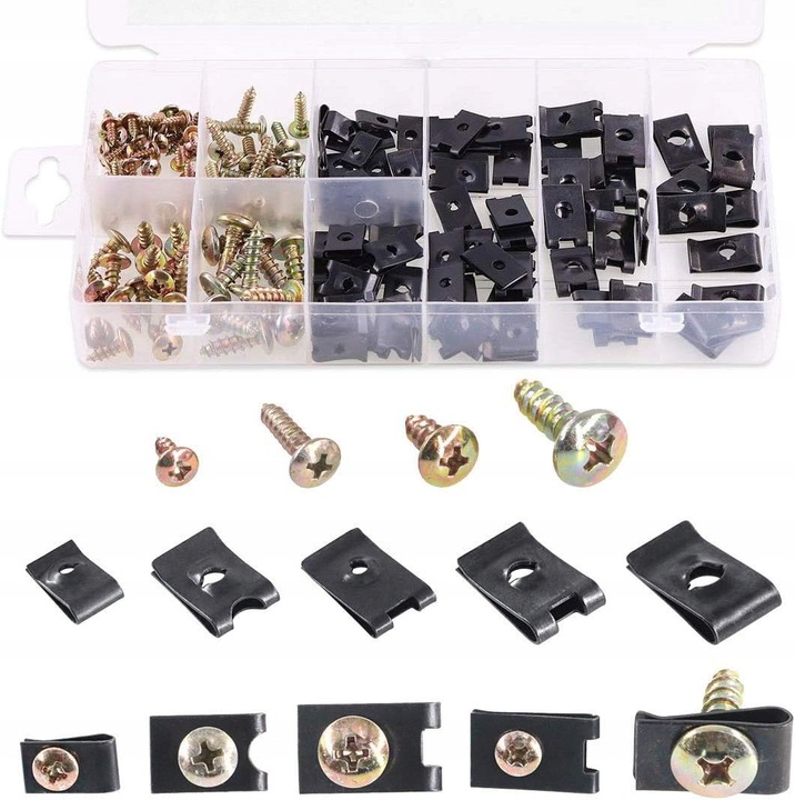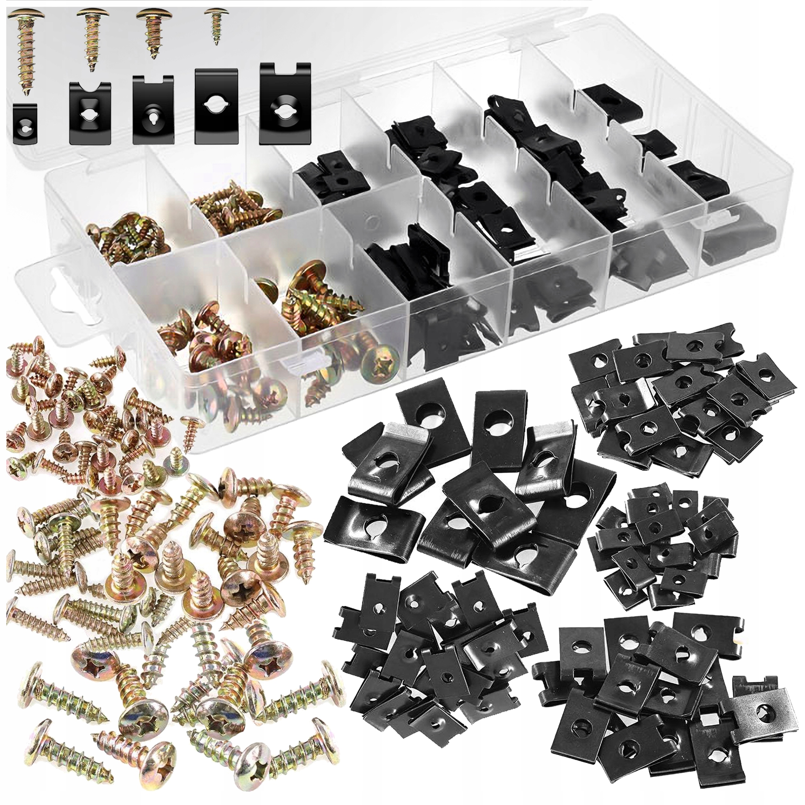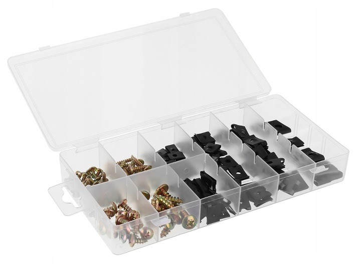 Zestaw 170 uniwersalnych wkrętów oraz podkładek typu U do karoserii zapakowanych w poręczne plastikowe etui.