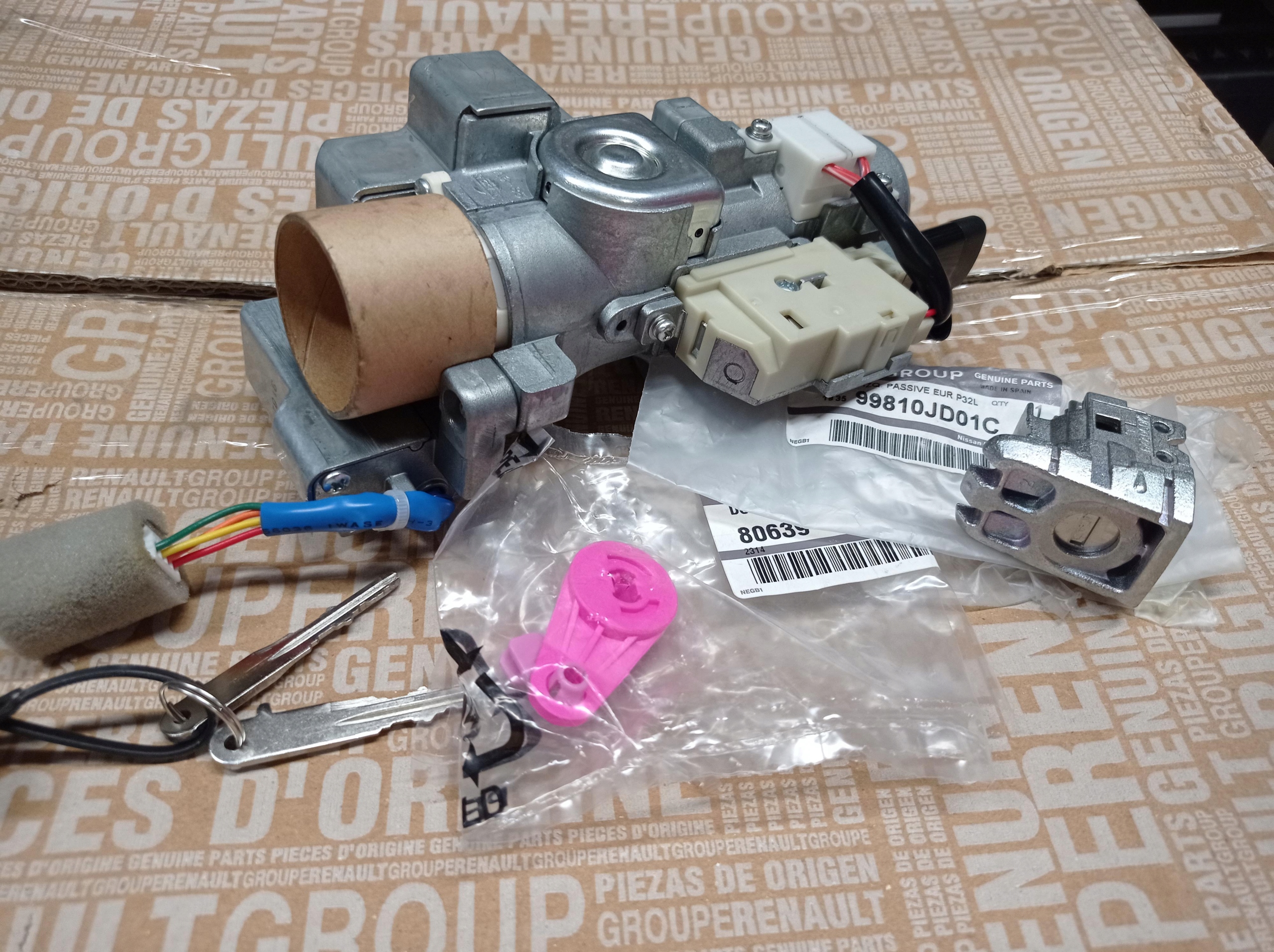 Stacyjka, dwa nowe groty (do przełożenia do starej oryginalnej główki z pilotem), wkładka zamka drzwi kierowcy, element mocujący wkładki