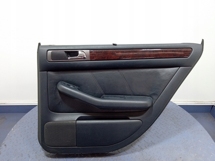 Opis: tapicerka ciemnoszara, skórzana, z roletą szyby, drewnianym dekorem, widoczne ślady użytkowania, -jakość B && A6 C5 AVANT TAPICERKA DRZWI TYŁ PRAWA ROLETA