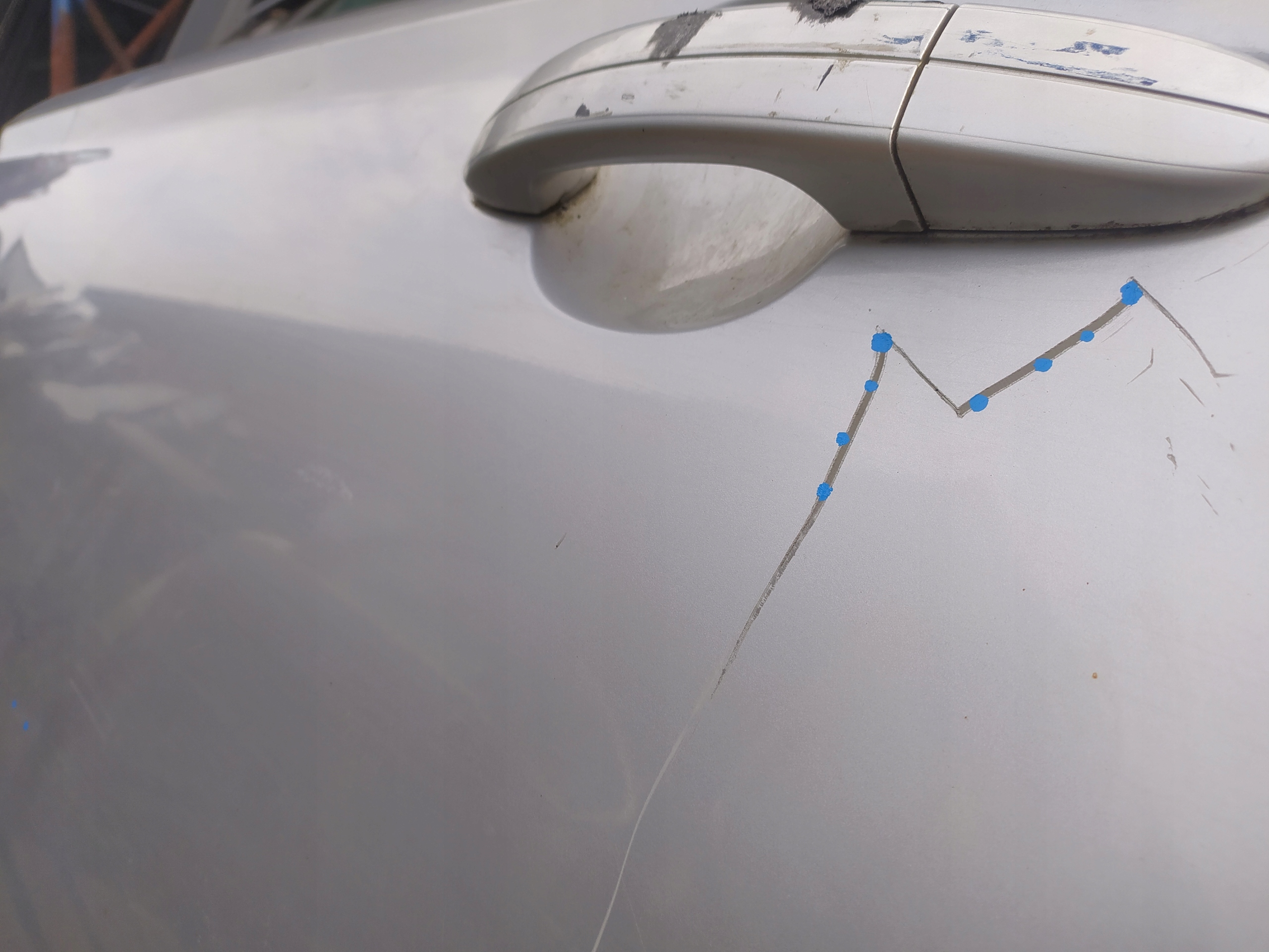 - uczciwie opisane i zaznaczone markerami uszkodzenia (nawet najmniejsze- nie zaznaczamy uszkodzeń powłoki lakierniczej, każdy element może wymagać ponownego lakierowania, nie mierzymy też grubości lakieru, ale jeśli po drzwiach widać, że były lakierowane, staramy się o tym wspomnieć w opisie),