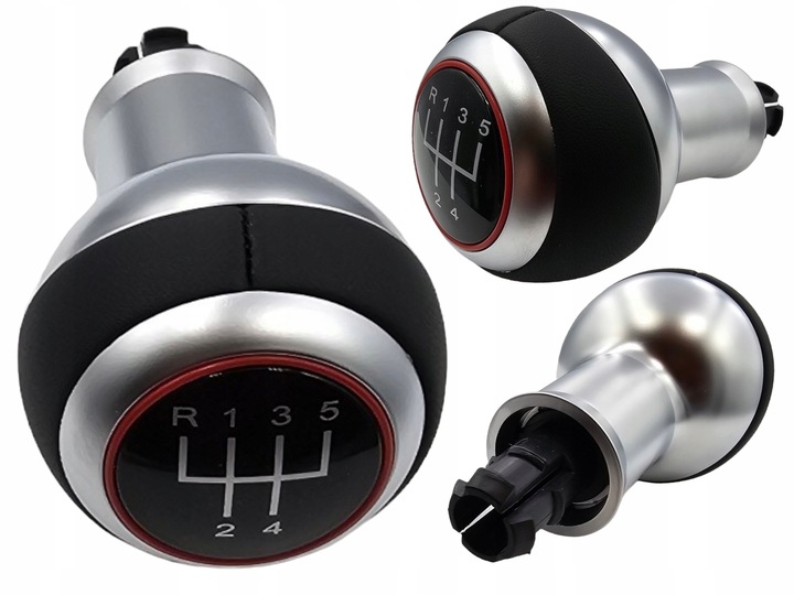 Oferujemy Państwu Piękna Stalową Gałkę zmiany biegów ze skórzanymi z zdobieniami i czerwonym ringiem.