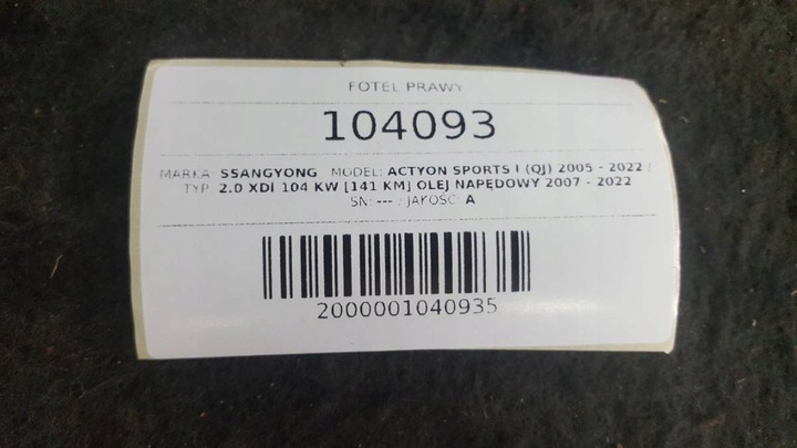 FOTEL PRAWY PASAŻERA SSANG YONG ACTYON SPORTS 2009 EU