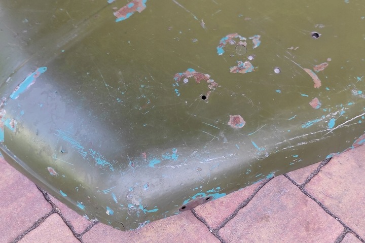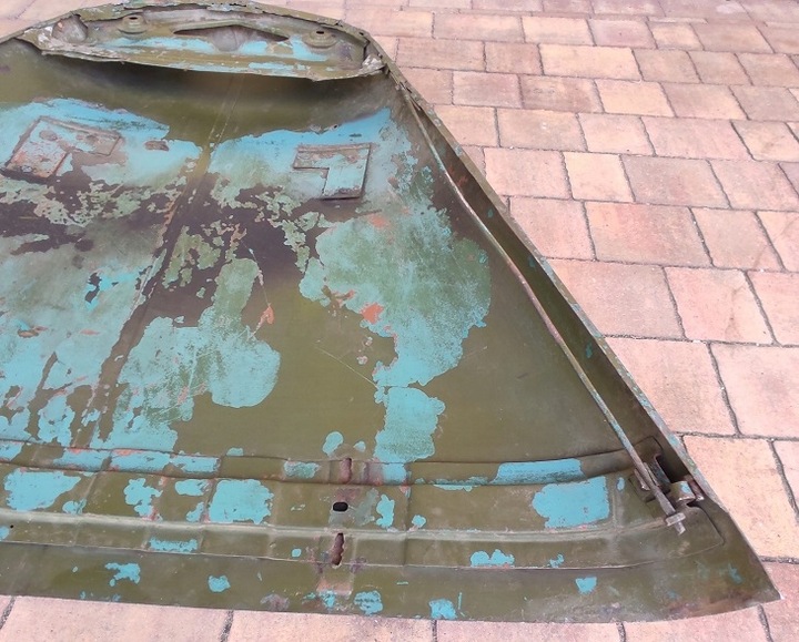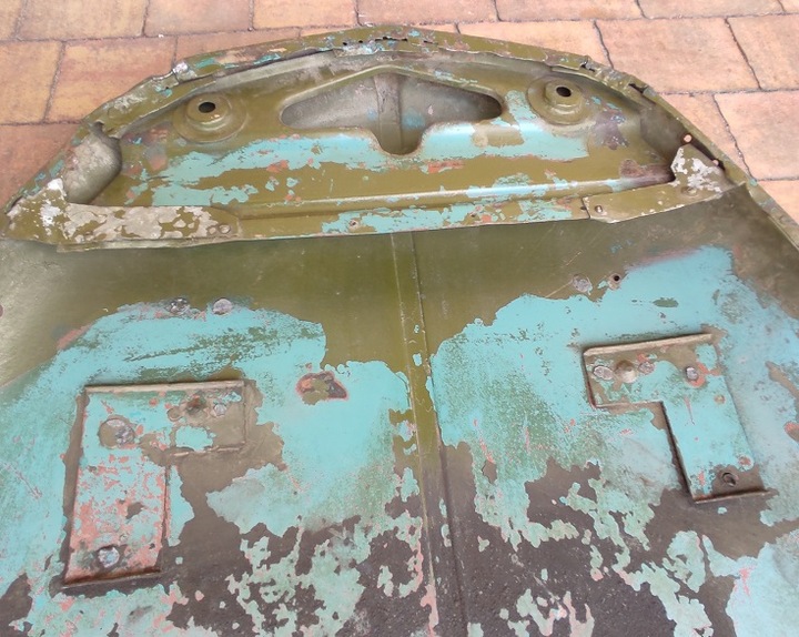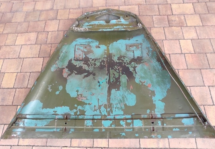 MASKA SILNIKA do GAZ 69. Dwie, trzy warstwy farby, schodzą od sprężonego powietrza. Otwory do mocowania otwartej szyby zaszpachlowane, częściowo widoczne (do oczyszczenie) .Brak korozji. Od 2002 na półce w magazynie.
