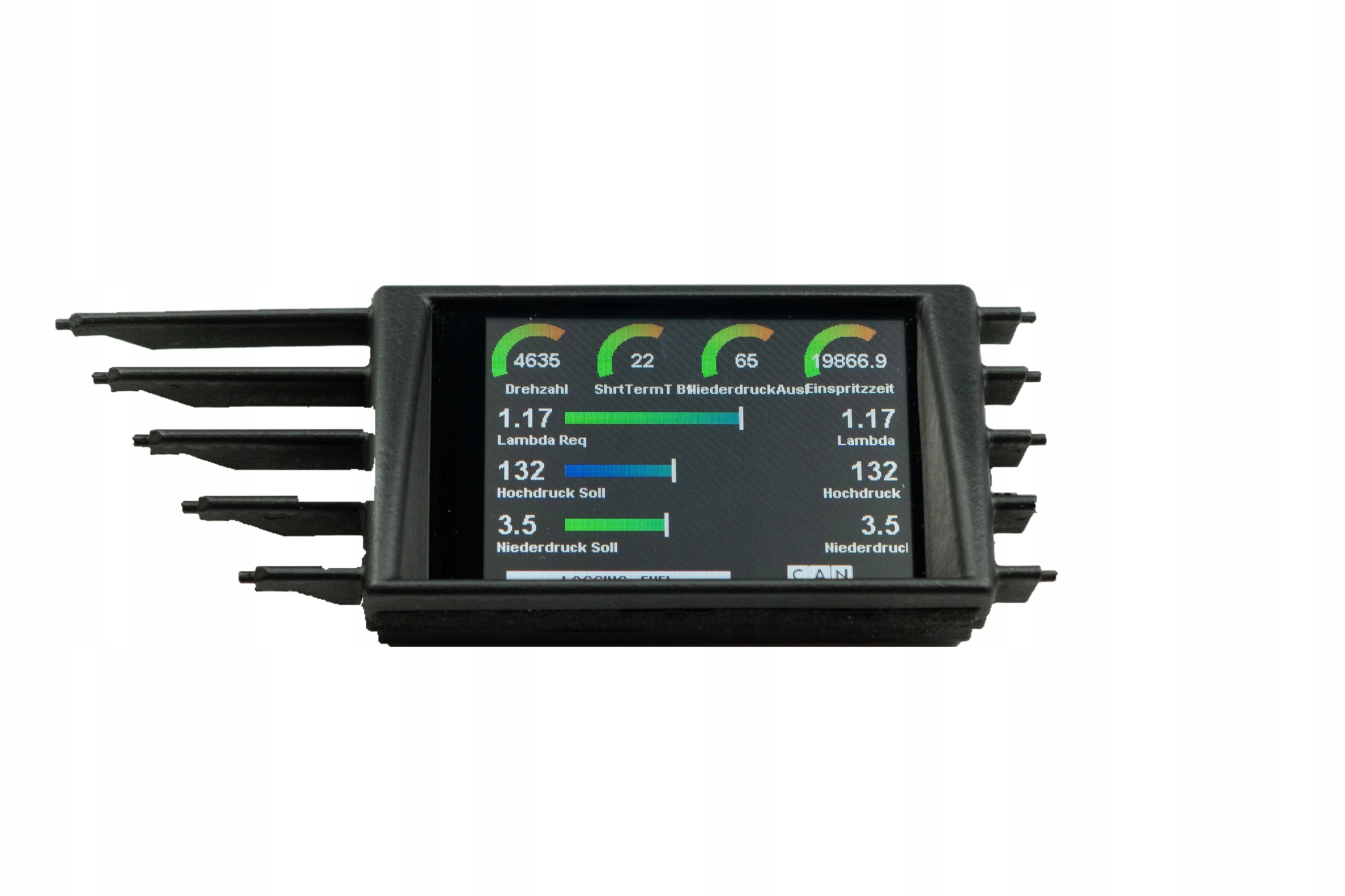 4 dodatkowe wejścia analogowe: Podłącz dodatkowe czujniki temperatury i/lub ciśnienia, aby uzyskać więcej opcji monitorowania, np takich jak temperatura spalin. Czujnik zawartości etanolu można podłączyć do jednego z wejść cyfrowych.
