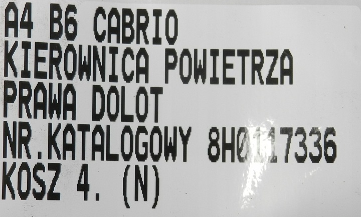 Каталожный номер запчасти: | AUDI A4 B6 01-05 CABRIO KIEROWNICA POWIETRZA PRAWA PRAWY PRZÓD 8H0117336 |