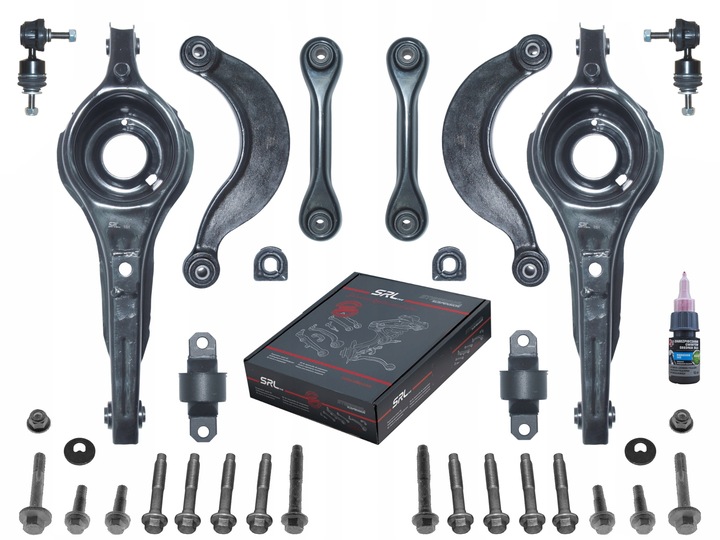 Nowy komplet wahaczy zawieszenia tylnego wraz z łącznikami stabilizatora, tulejami wahacza wzdłużnego i kompletem śrub montażowych