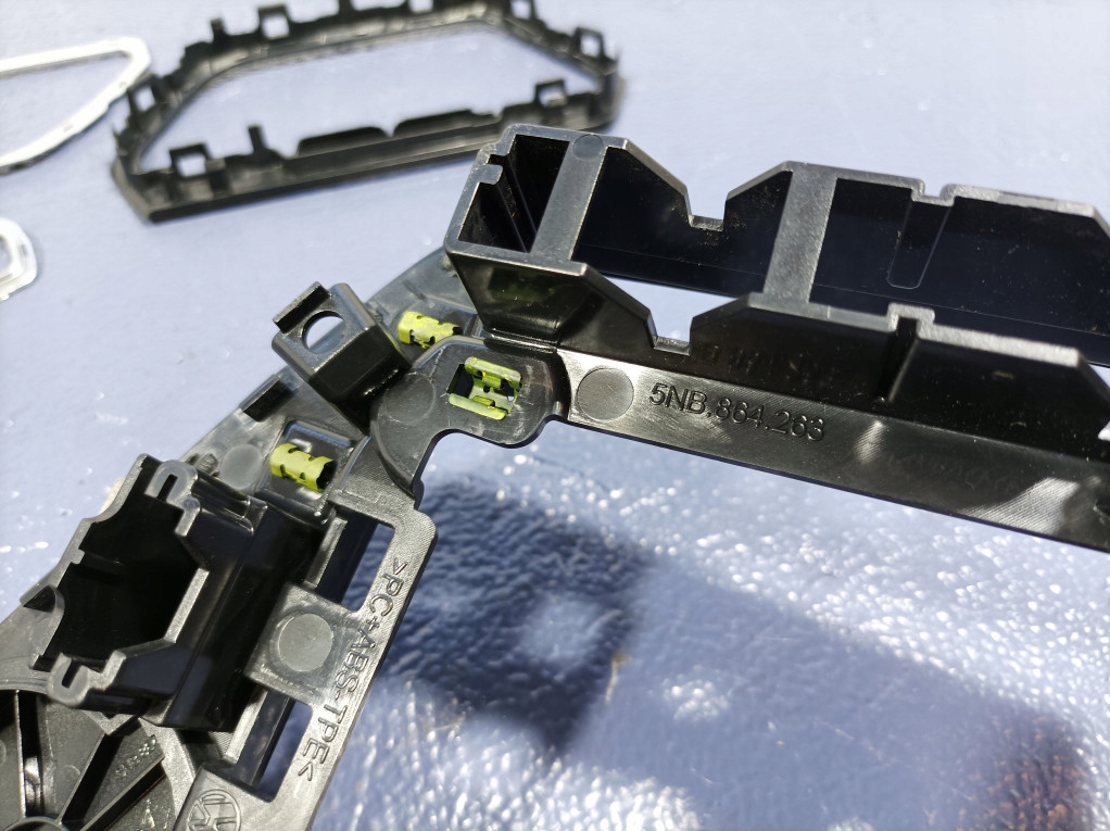 Opis: komplet dekorów 4ZB, w zestawie listwa dekor ramka licznika 5NB857059, ramka wyświetlacza radio nawigacji 5NA858069D, obudowa kolumny kierowniczej 5G0858559, 5G0858565, dekor ramka dźwigni zmiany biegów 5NB864263, dekor ramka panelu klimatyzacji 5NB820073A, ramka kratki nawiewu prawej 5NB819742, panel posrebrzany 5NB858418, widoczne ślady użytkowania, zadrapania, -jakość B && VW TIGUAN II LISTWY DEKORY DESKI ROZDZIELCZEJ 5NB857059