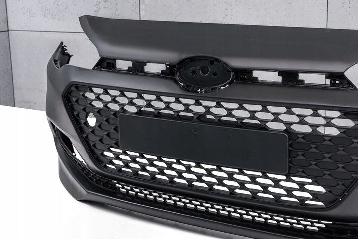 Zderzak przedni, dla HYUNDAI i20 II (GB) 2014-2018 (wersja przed faceliftingiem). W zestawie grill przedni i atrapa dolna zderzaka.