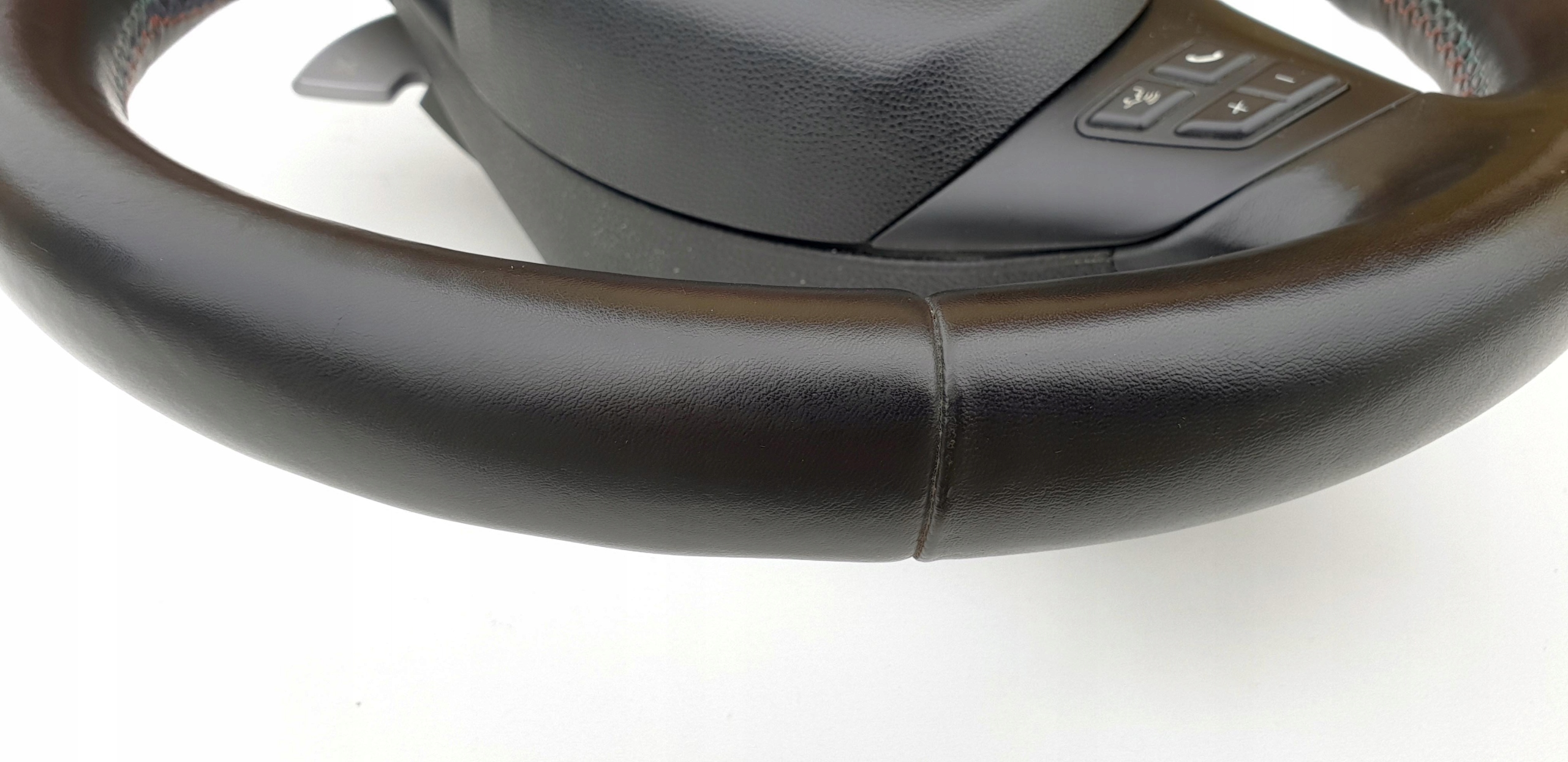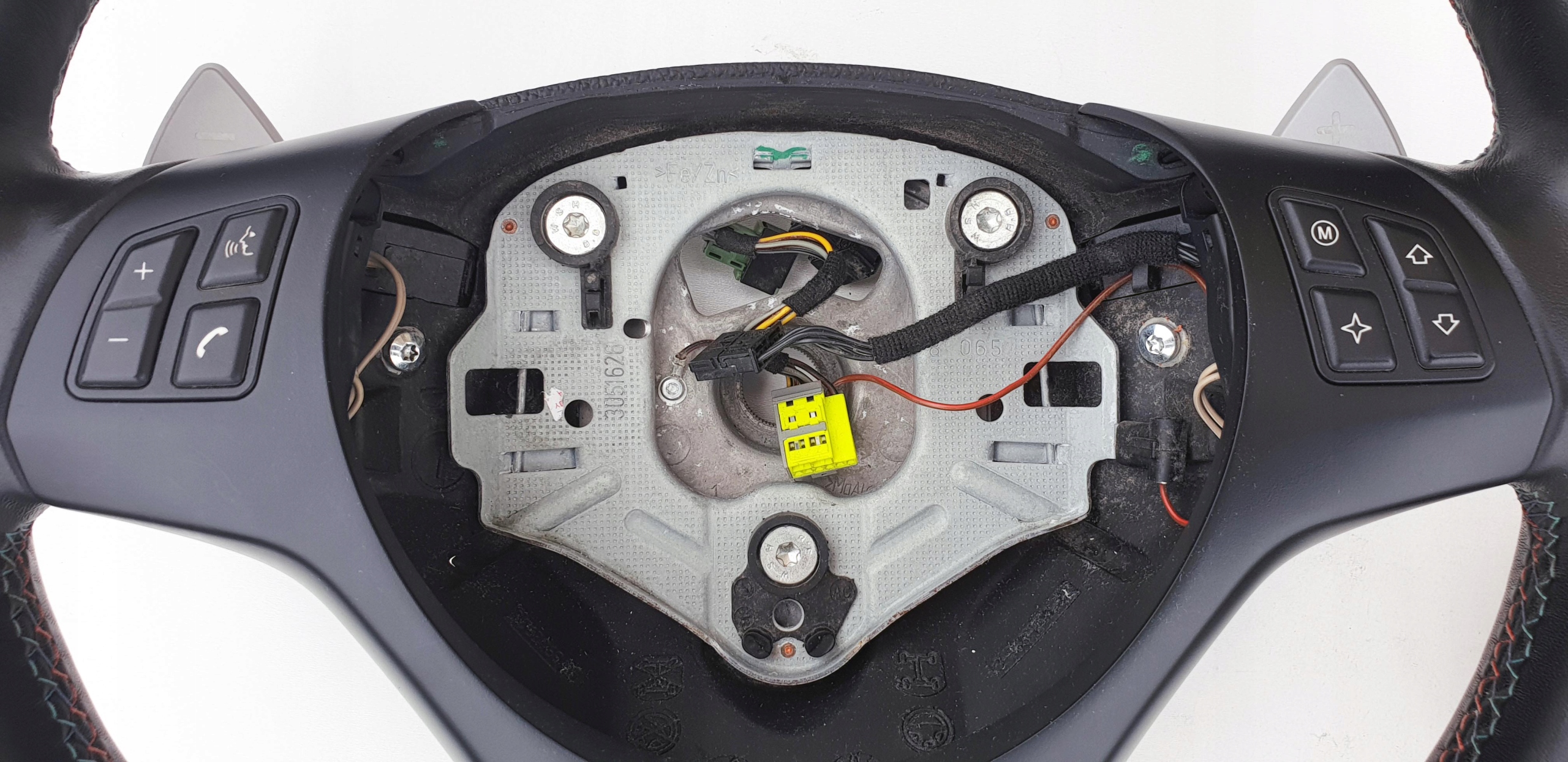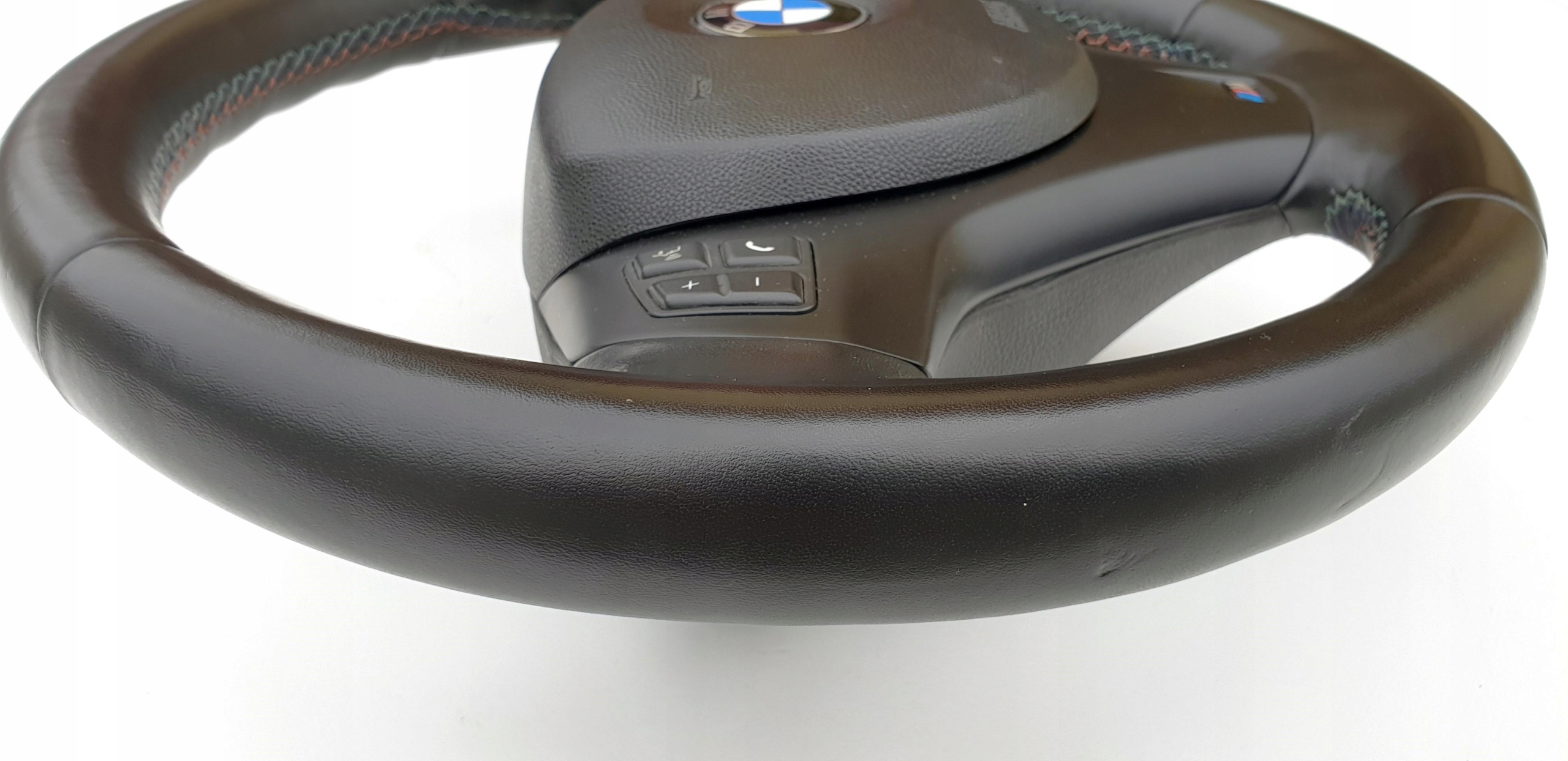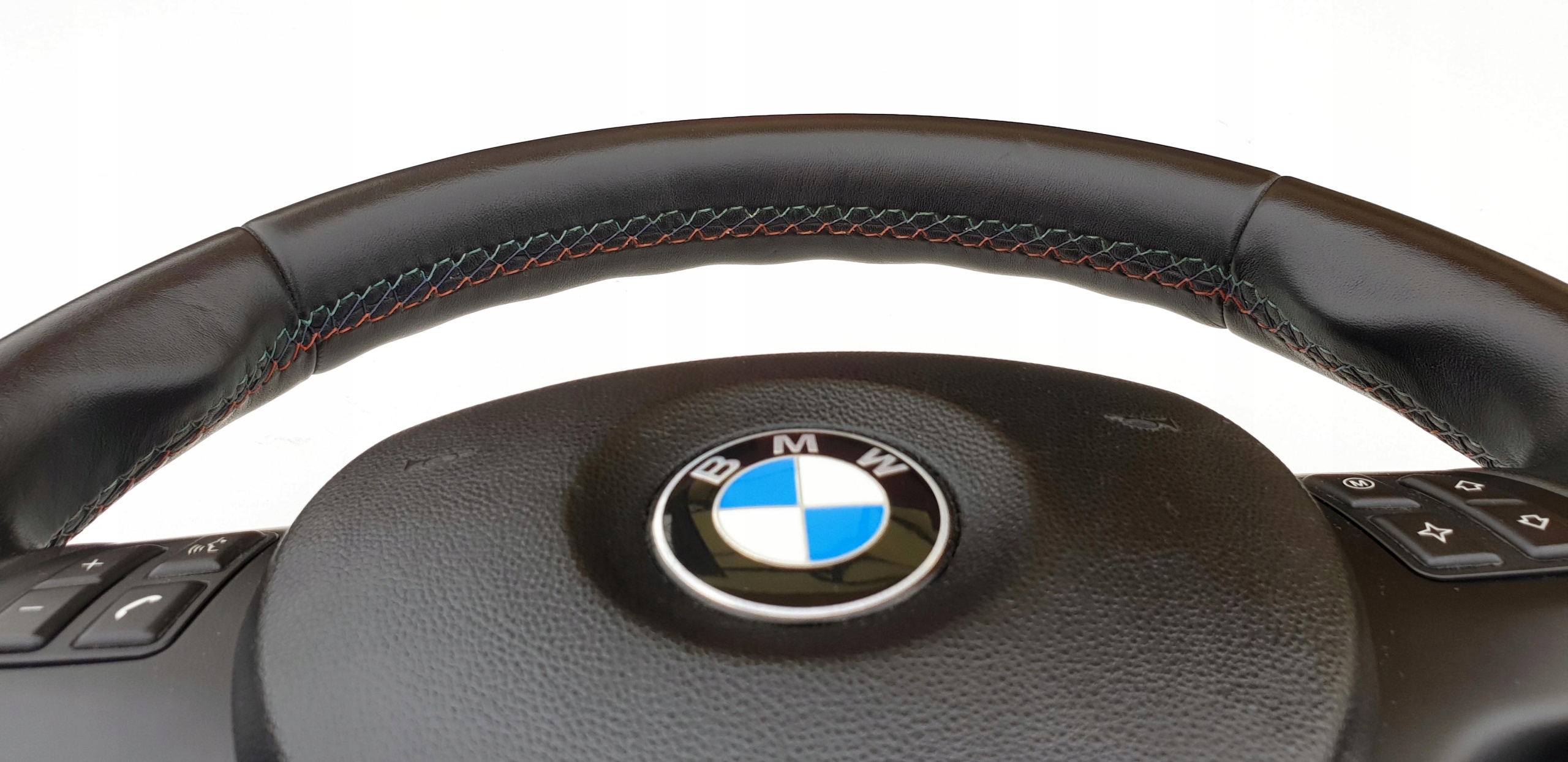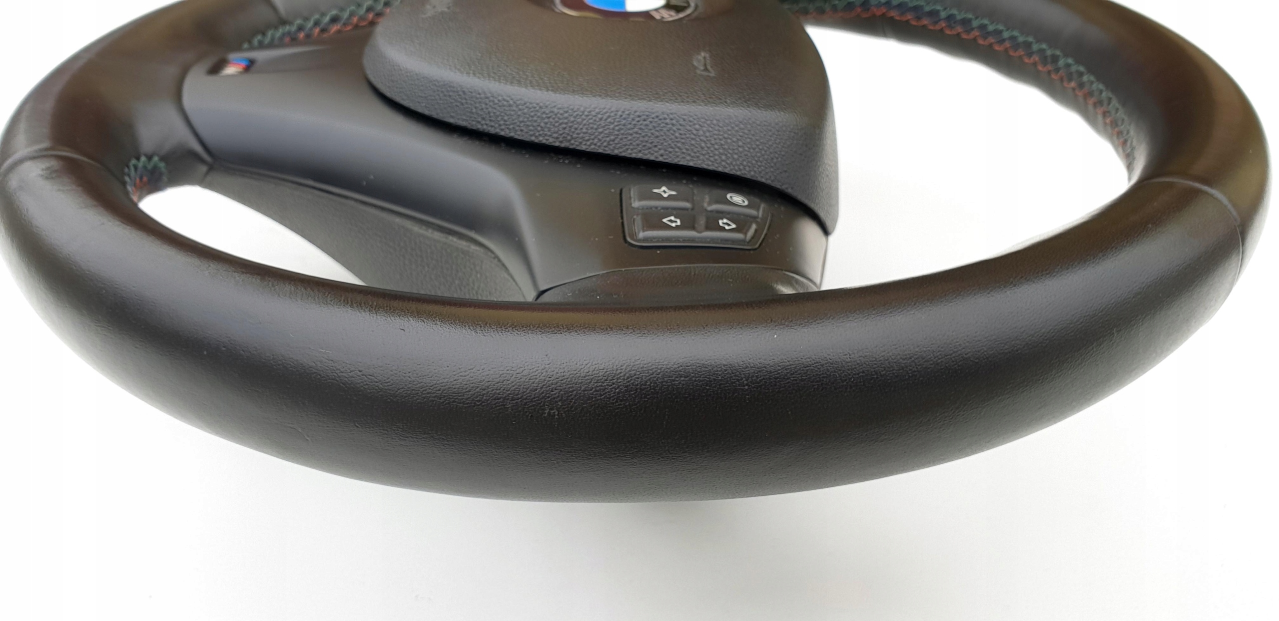 Kierownica jak widać na zdjęciach w bardzo fajnym stanie. Skóra cała, nie ma oznak wytarć, jakiś szorstkich fragmentów - fajna, delikatna w dotyku. Nie ma również jakiś przebarwień. Widać doskonale strukturę skóry co też potwierdza jej bardzo dobry stan. Oczywiście jakieś małe wgnioteczki po obrączce czy ryski się znajdą, ale naprawdę nie ma tragedii. Szwy jak przystało na wersję m-power "kolorowe" - całe, nic nie puściło. Kierownica oczywiście prosta, sztywna - nie ma luzów. Lera bardzo ładna, bez defektów. Przyciski multifunkcji i łopatki bardzo ładne. Poduszka ładna, emblemat BMW okej. Wieloklin kierownicy okej, frezy widoczne. Myślę, że kierownica naprawdę warta uwagi, fajny egzemplarz.