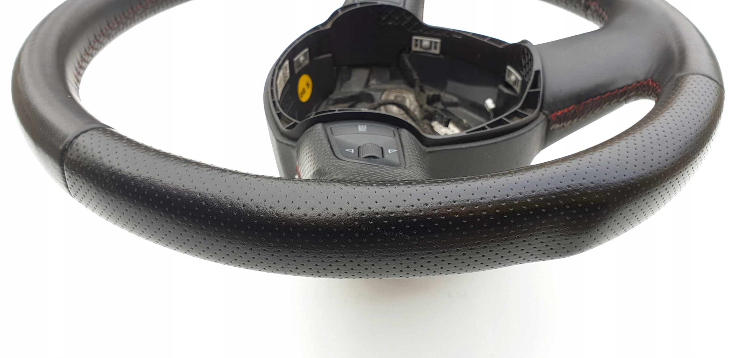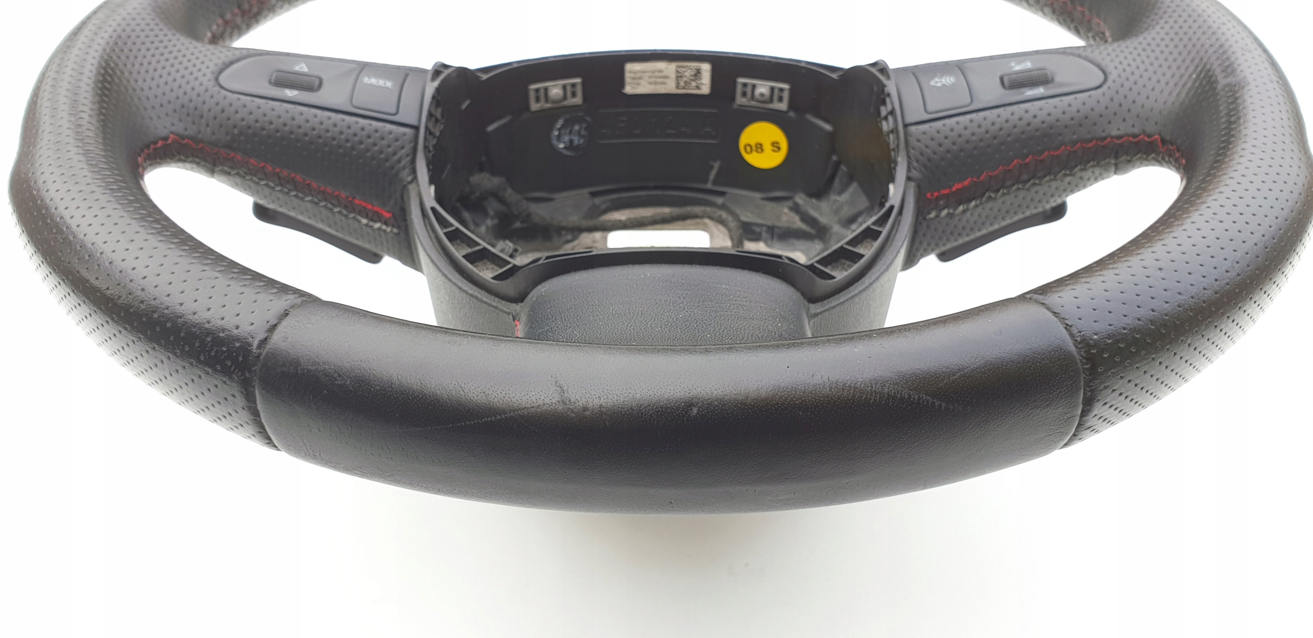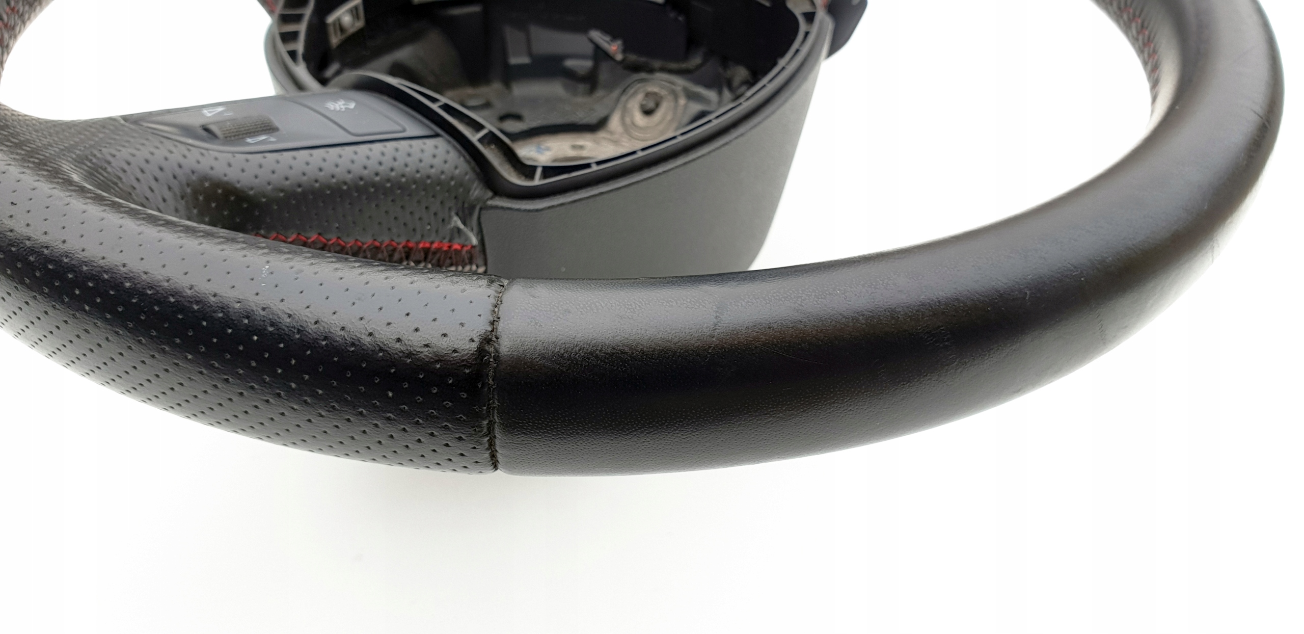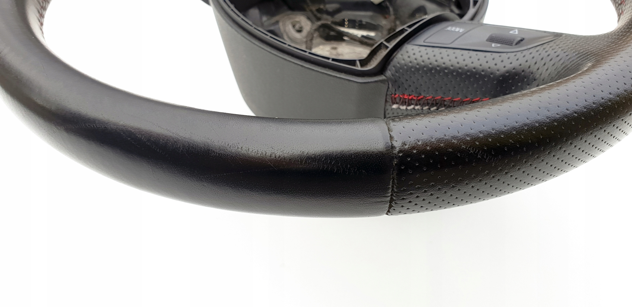 Kierownica ogólnie bardzo ładna. Skóra cała, nie jest szorstka, nie jest powycierana - fajna, delikatna w dotyku. Oczywiście jakieś zarysowania, małe wgniotki m.in. po obrączce posiada, doskonale to widać na zdjęciach. Szwy bardzo ładne, w pięknym s-line'owych kolorkach. Łopatki ładne, kierownica prosta, sztywna (nie okręca się na drucie), wieloklin OK, frezy widoczne. Myślę, że warta polecenia.