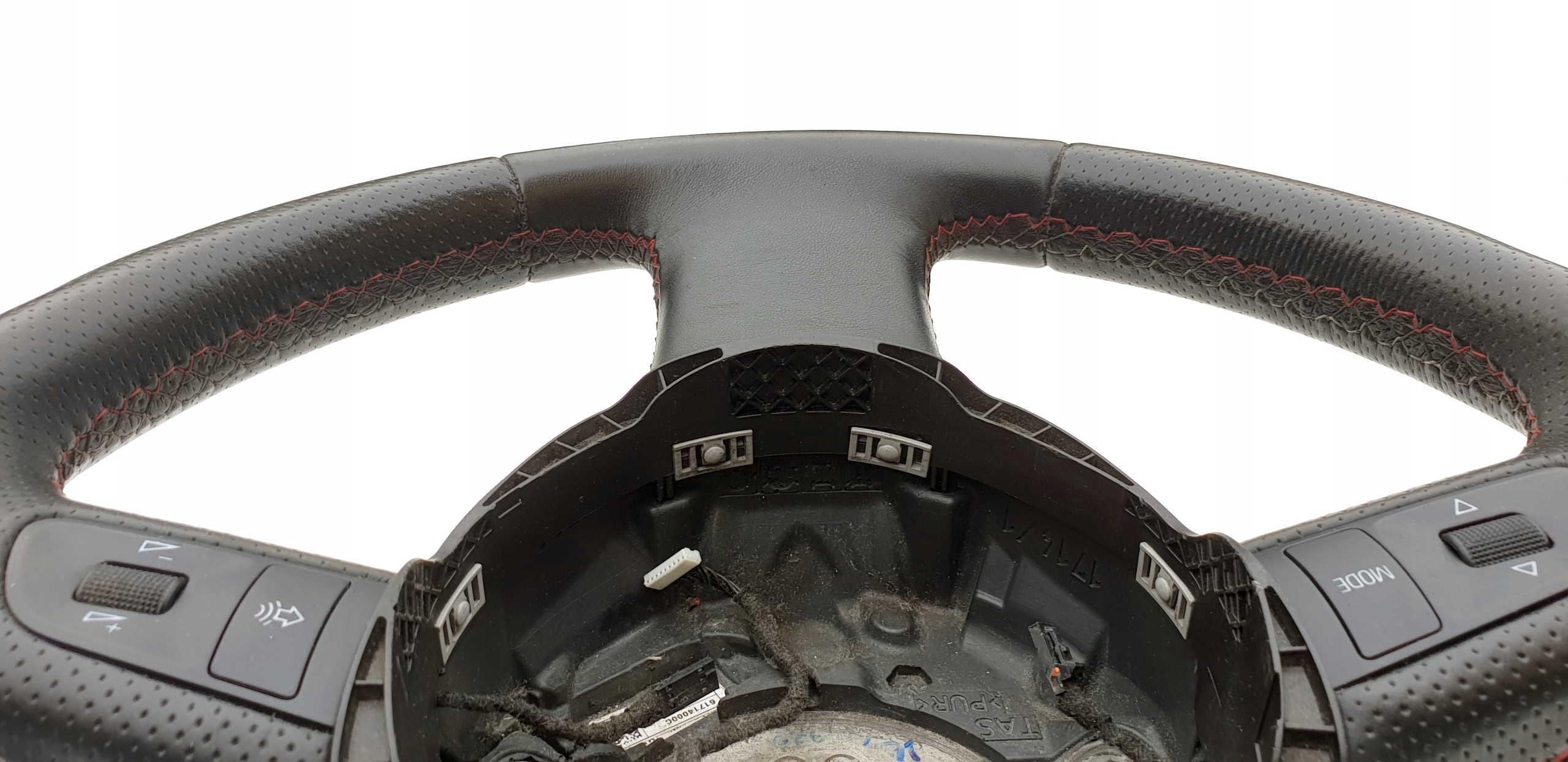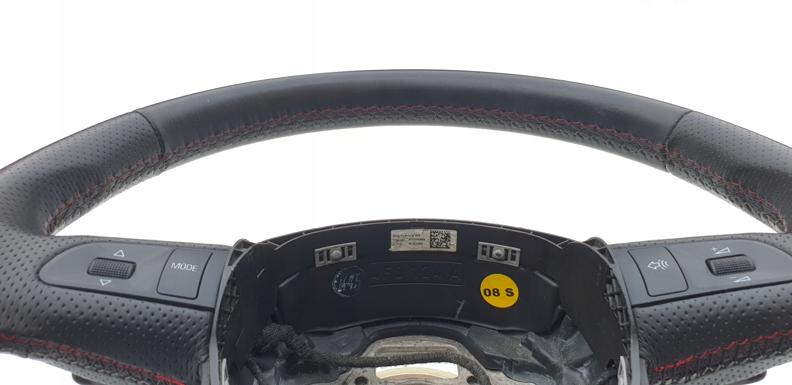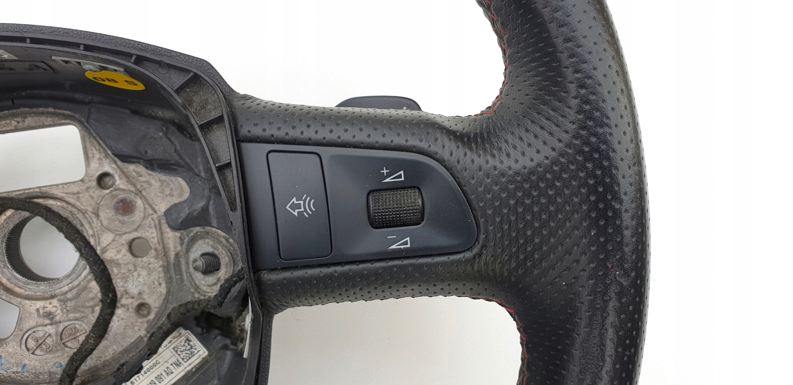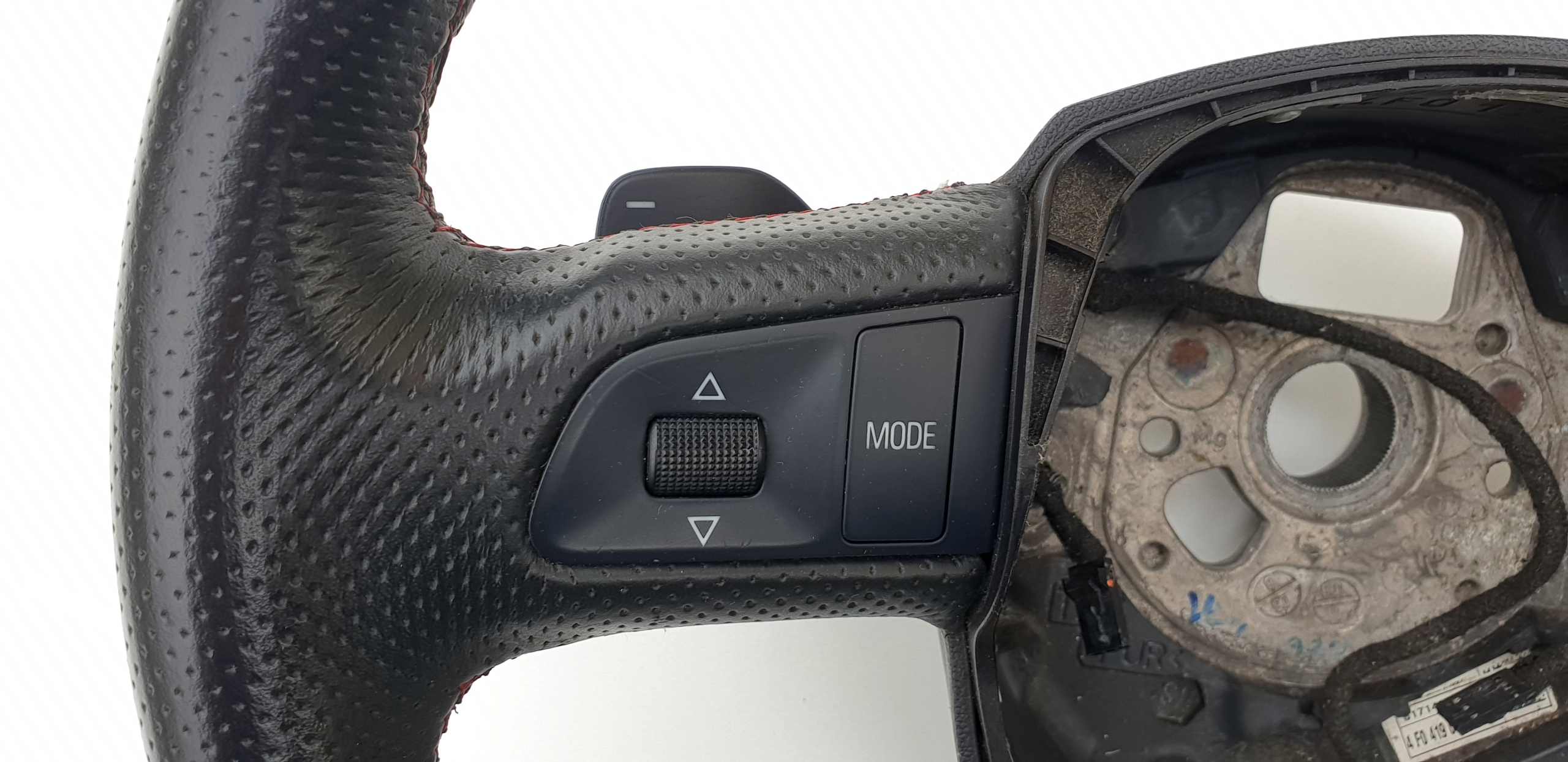 Kierownica ogólnie bardzo ładna. Skóra cała, nie jest szorstka, nie jest powycierana - fajna, delikatna w dotyku. Oczywiście jakieś zarysowania, małe wgniotki m.in. po obrączce posiada, doskonale to widać na zdjęciach. Szwy bardzo ładne, w pięknym s-line'owych kolorkach. Łopatki ładne, kierownica prosta, sztywna (nie okręca się na drucie), wieloklin OK, frezy widoczne. Myślę, że warta polecenia.