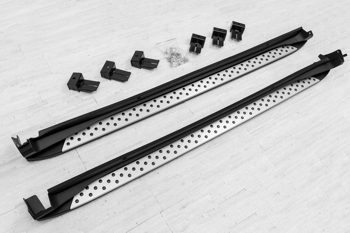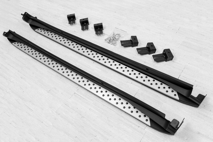 Zestaw zawiera komplet stopni bocznych (prawy i lewy), elementy montażowe oraz instrukcję. Progi montowane są na fabrycznych punktach montażowych. Montaż stopni nie wymagają wiercenia dodatkowych otworów! Zalecamy profesjonalny montaż w warsztacie (z doświadczenia wiemy że najlepiej skorzystać z usług zakładu lakierniczego lub blacharskiego - to właśnie tam najczęściej wykonywane są instalacje listew, dokładek oraz stopni, więc montaż dla tych zakładów jest czynnością intuicyjną).