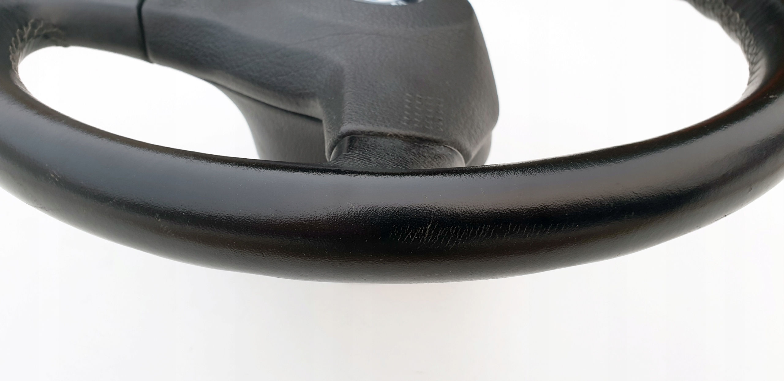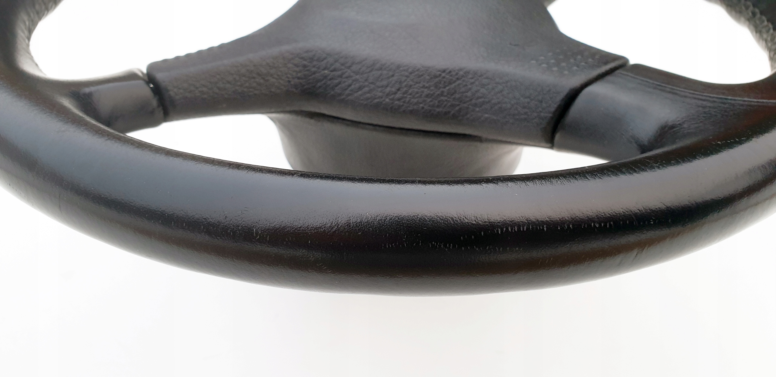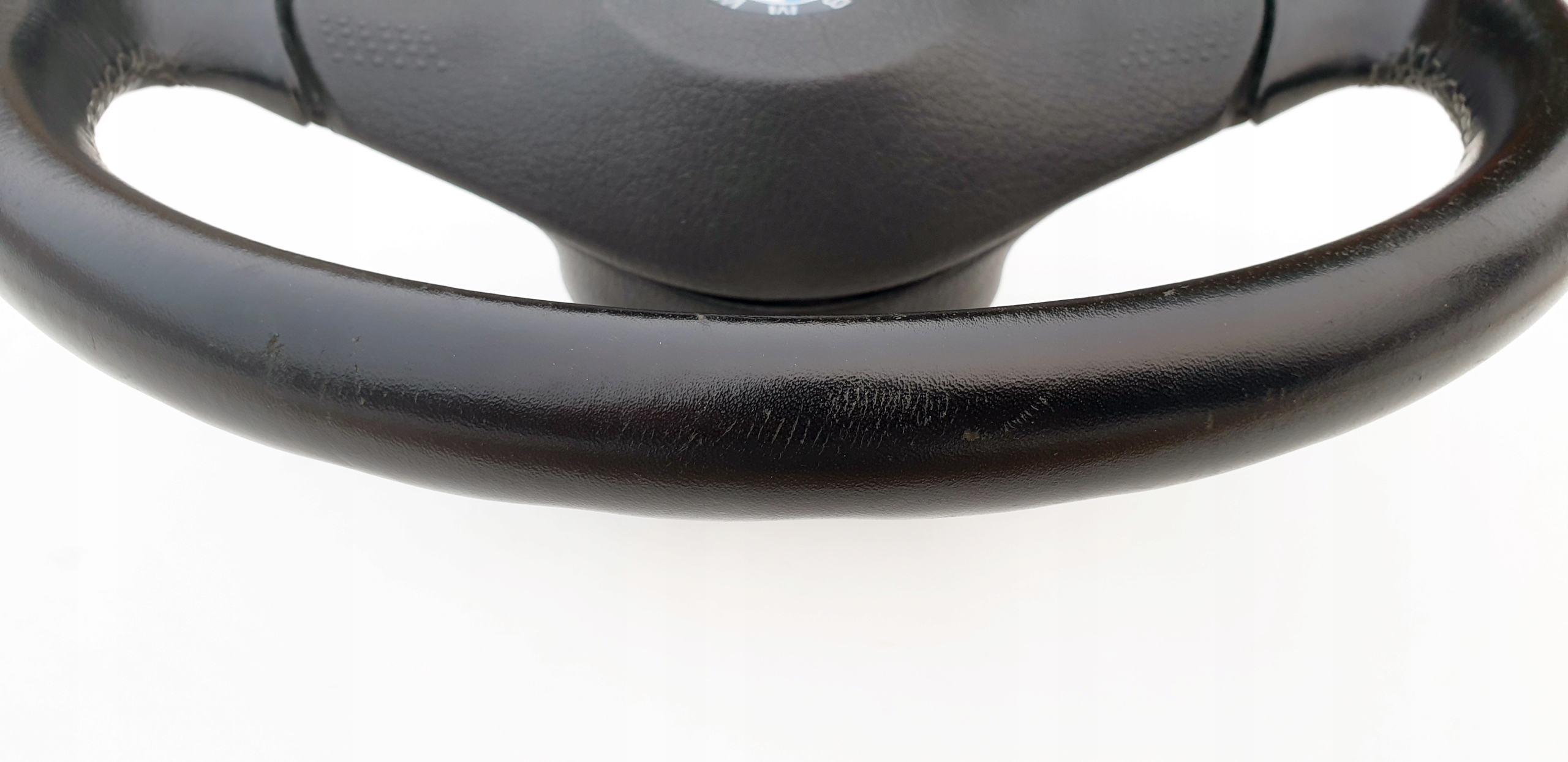 Kierownica ładna, przede wszystkim widać, że skóra jest oryginalna. Nie ma przetarć, nie jest szorstka, ale jak widać na zdjęciach ma sporo rysek czy nawet rys głównie po obrączce, niemniej jednak tak jak napisałem skóra fajna, struktura jak widać została zachowana. Sztywna, nie okręca się na drucie. Szwy wszystkie całe. Wielkolin piękny, frezy bardzo ładne co również widać na zdjęciach.