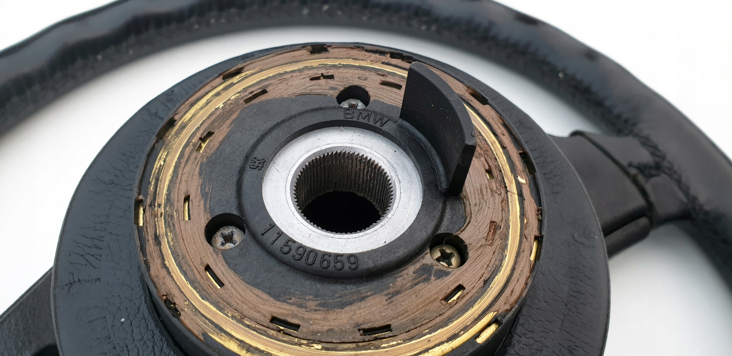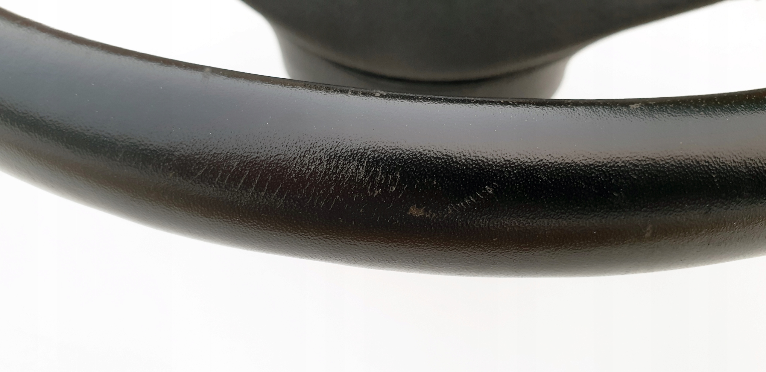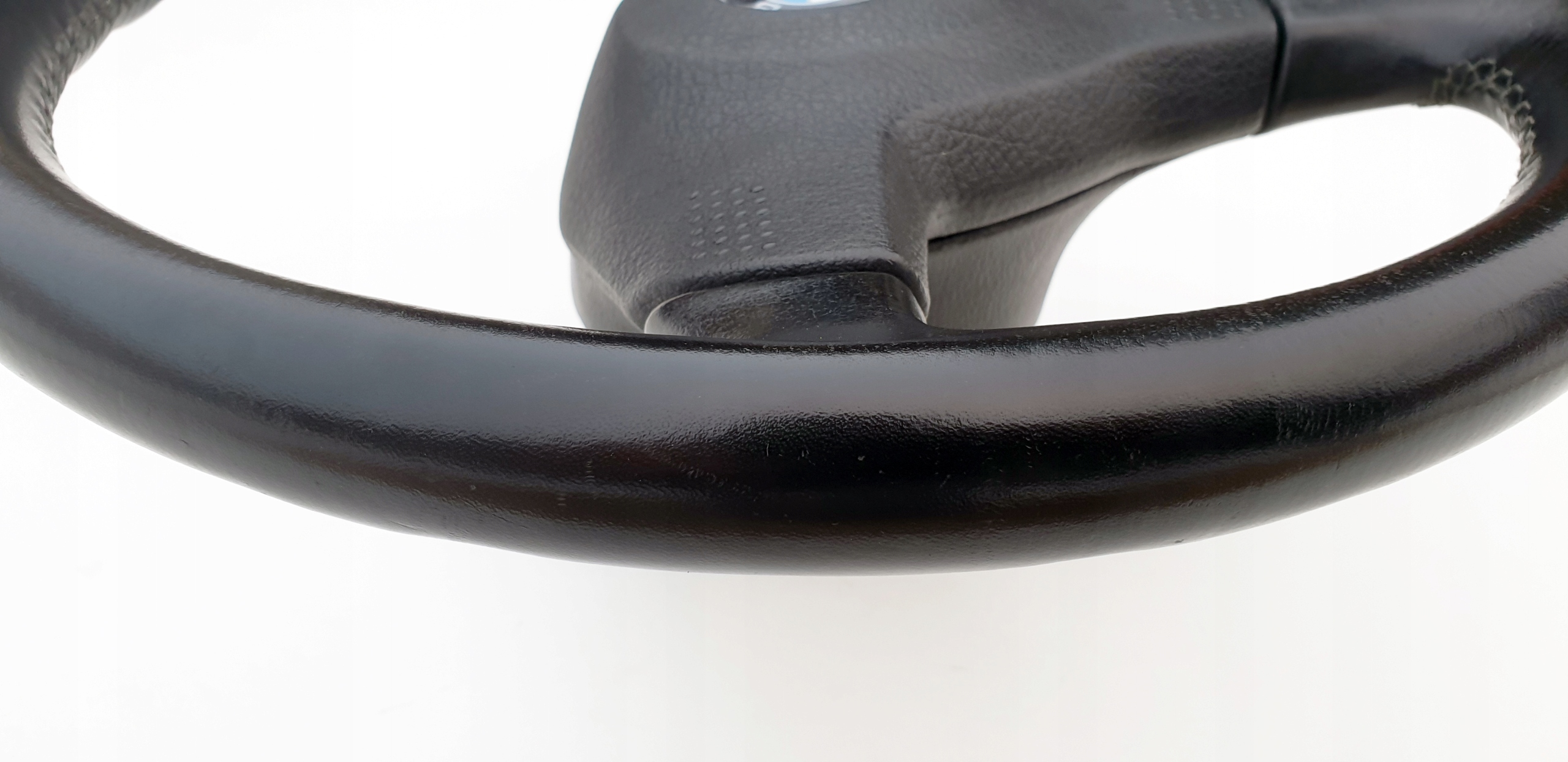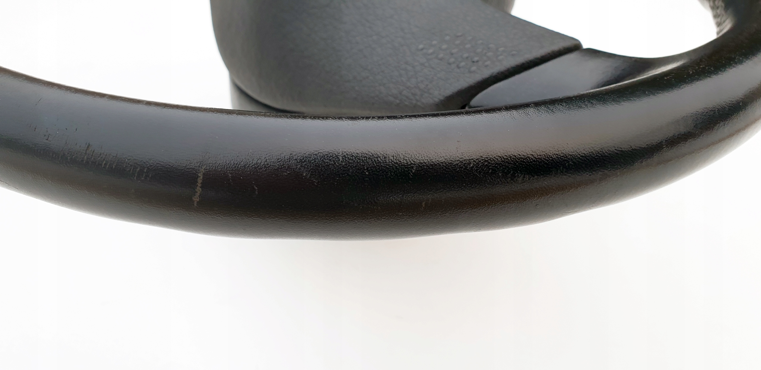 Kierownica ładna, przede wszystkim widać, że skóra jest oryginalna. Nie ma przetarć, nie jest szorstka, ale jak widać na zdjęciach ma sporo rysek czy nawet rys głównie po obrączce, niemniej jednak tak jak napisałem skóra fajna, struktura jak widać została zachowana. Sztywna, nie okręca się na drucie. Szwy wszystkie całe. Wielkolin piękny, frezy bardzo ładne co również widać na zdjęciach.
