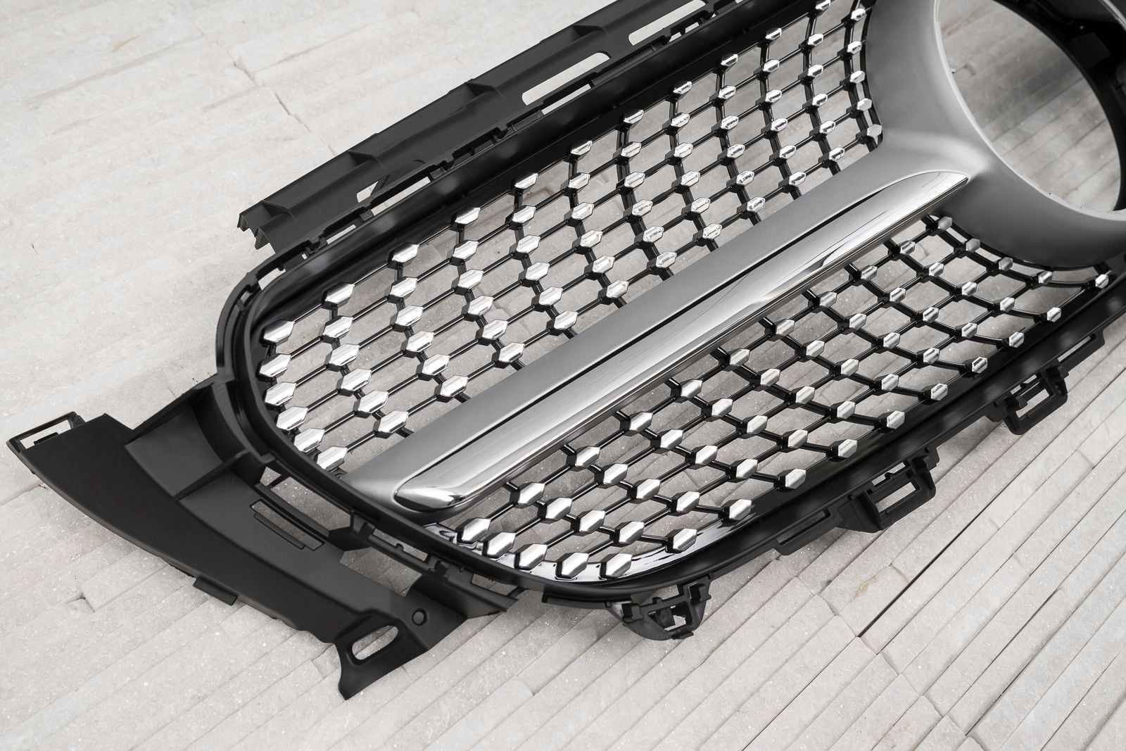 Dedykowany grill zaprojektowany został tak, aby ideealnie komponować się z elegancją Mercedesa. Siatka grilla ozdobiona została pinami w srebrnym kolorze, które rozchodząc się promieniście po obu stronach elementu, nadają mu imponujący oryginalnością styl, typowy dla najbardziej luksusowych modeli. Element wypełnia przestrzeń wokół znaku MERCEDES, otaczając go pełną elegancji ramą. Grill DIAMOND pozwala wykreować modną, nowoczesną stylizację samochodu, podkreślając pełną klasy duszę E-CLASS.