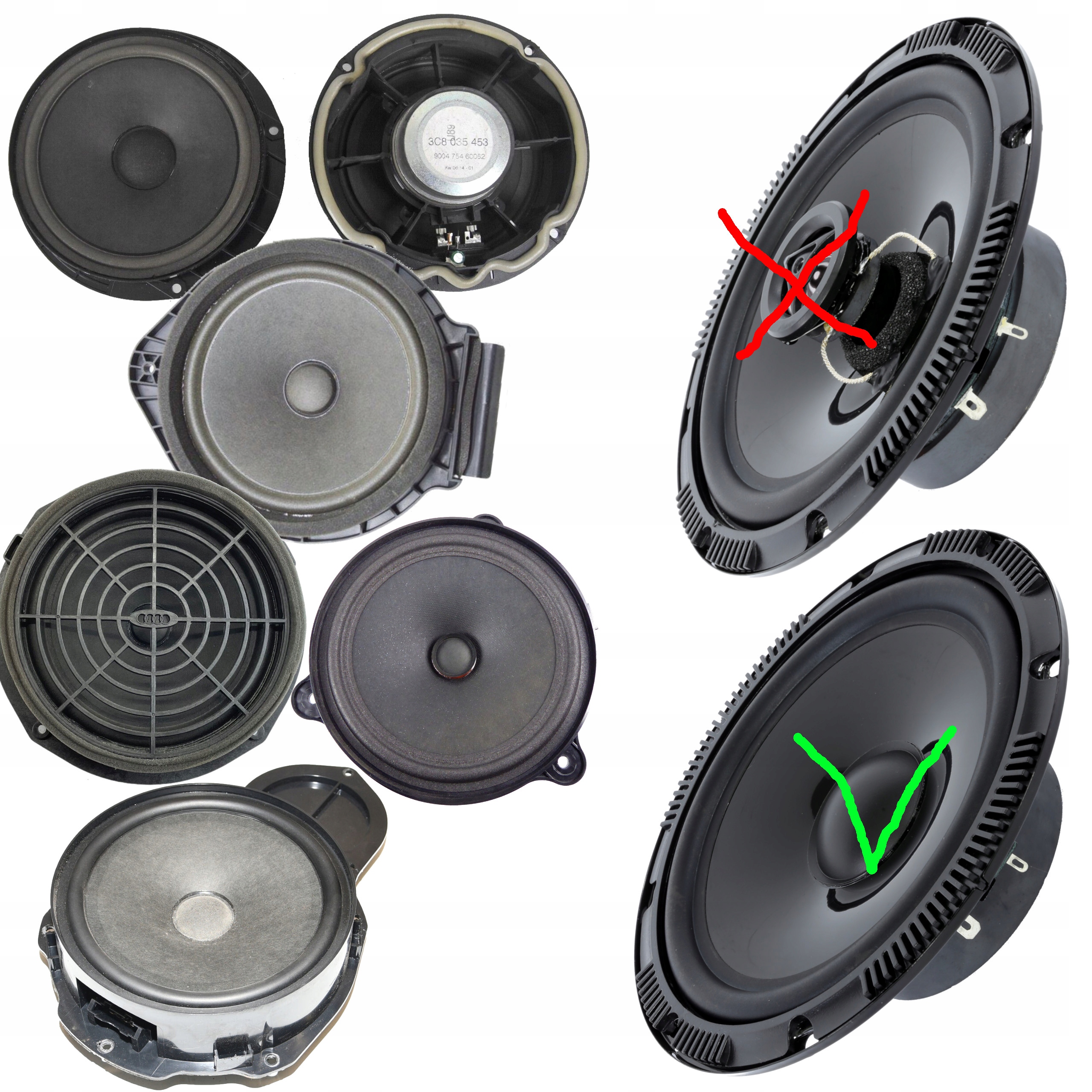 PRZEDMIOTY POKAZANE NA TYM ZDJĘCIU NIE SĄ PRZEDMIOTEM TEJ OFERTY. SŁUŻĄ JEDYNIE DO ZOBRAZOWANIA DLACZEGO NIE WARTO ZAMIENIAĆ ORYGINALNYCH FABRYCZNYCH GŁOŚNIKÓW BASOWYCH NA INNE NIEBASOWE.