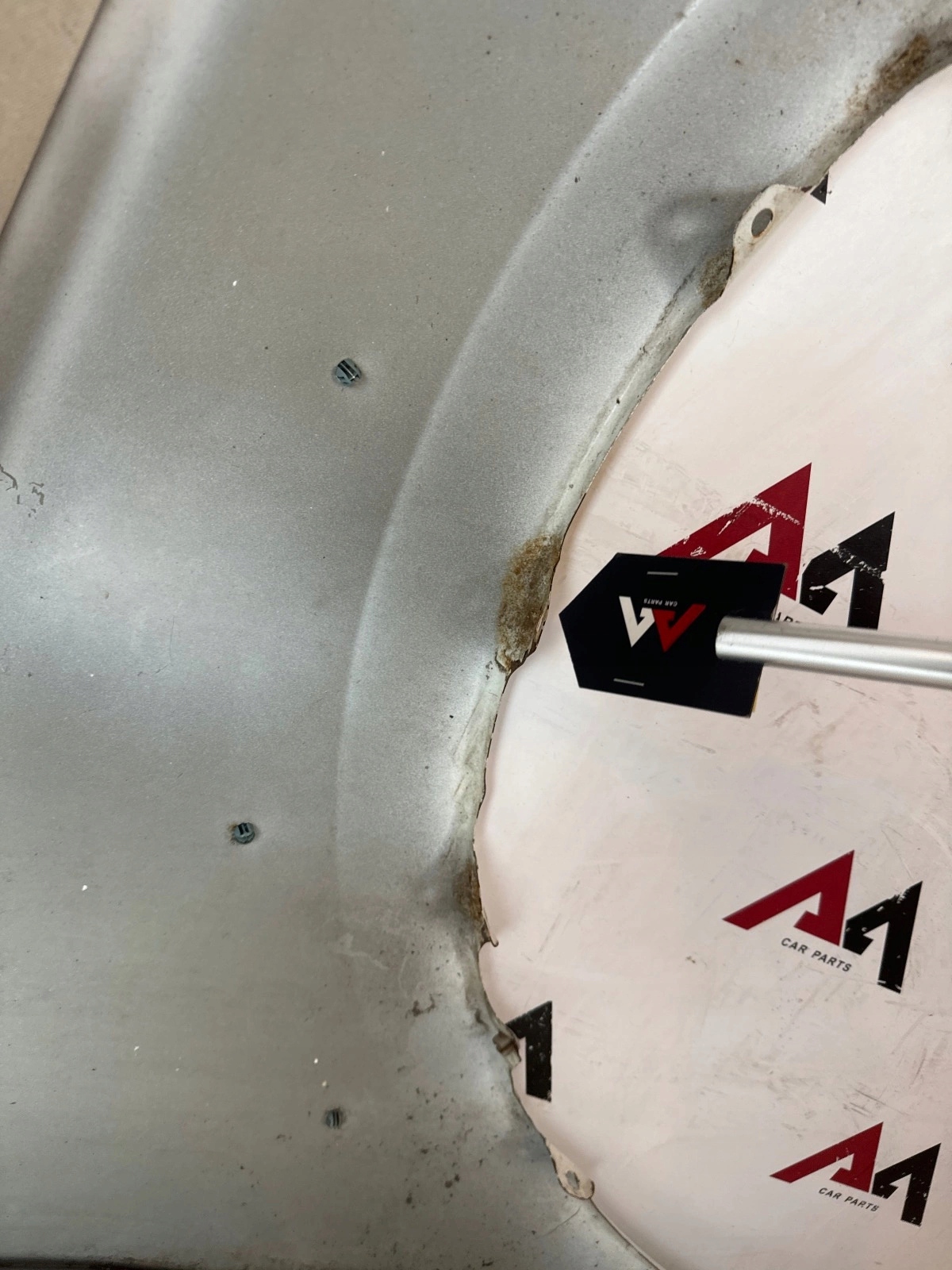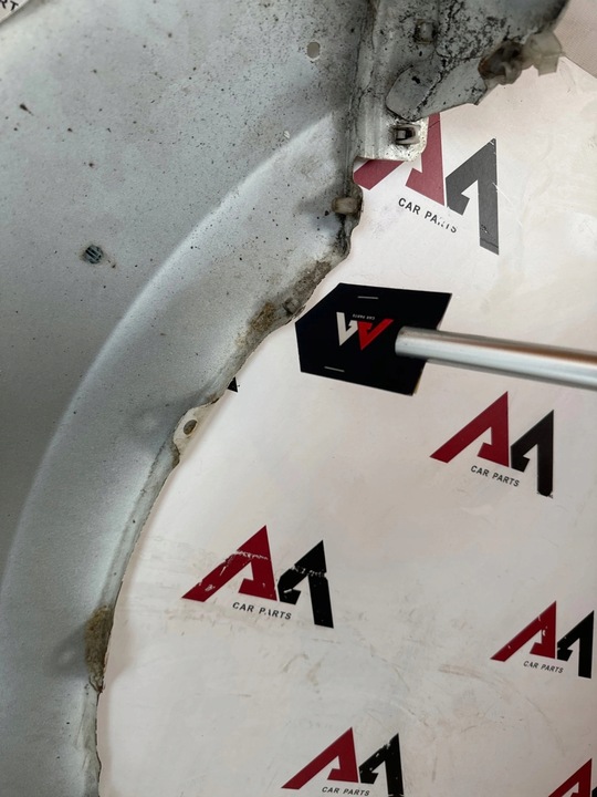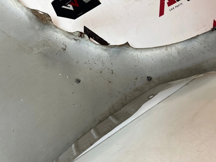 Błotnik posiada rysy, zadrapania, poodginane mocowania boczne na rancie z delikatnym nalotem rdzy, mała wgniotka przy boku, pokazane na zdjęciach.