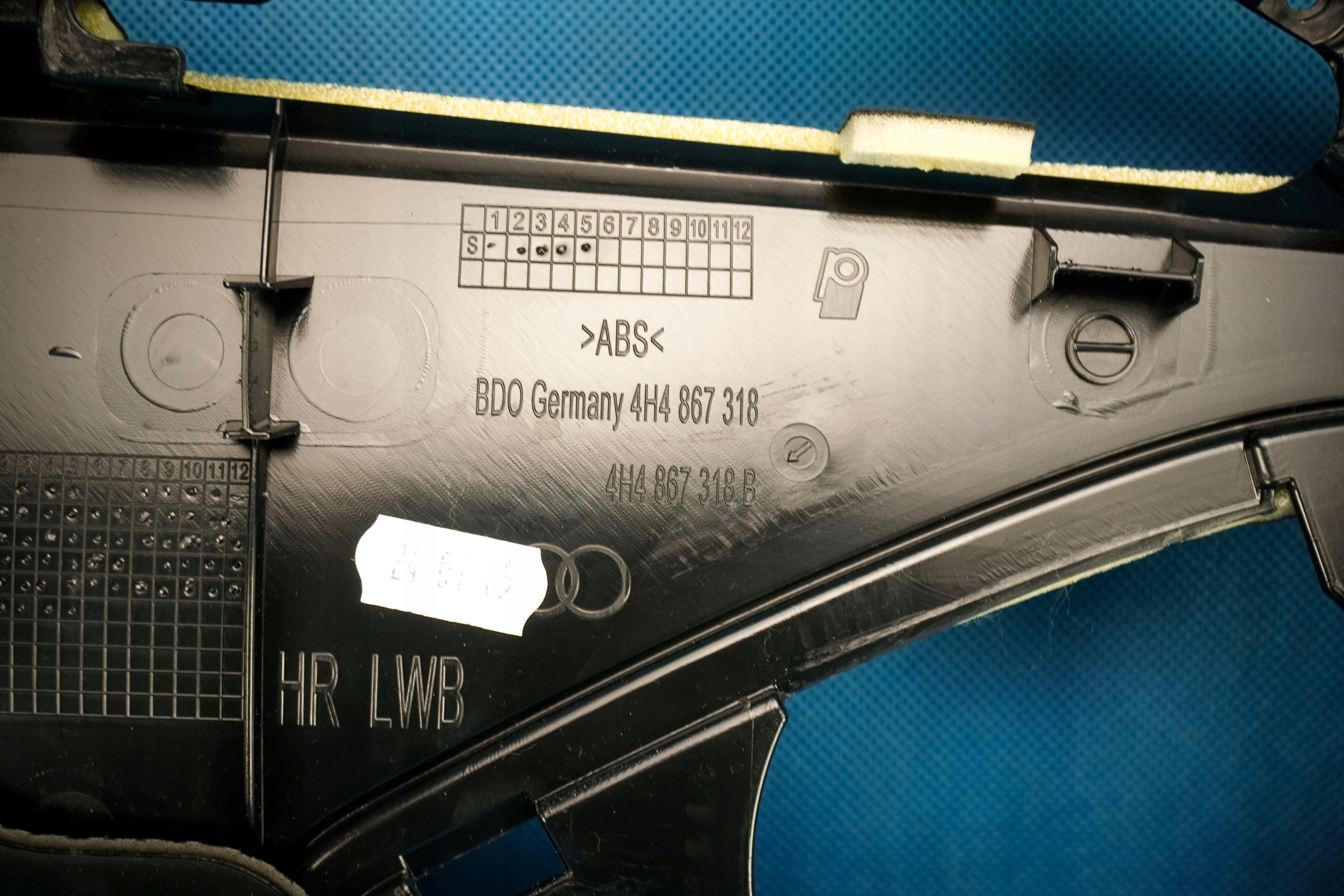 Przedmiotem sprzedaży jest boczek/tapicerka prawych tylnych drzwi (alcantara) do Audi A8 4H Long pod elektryczną roletę