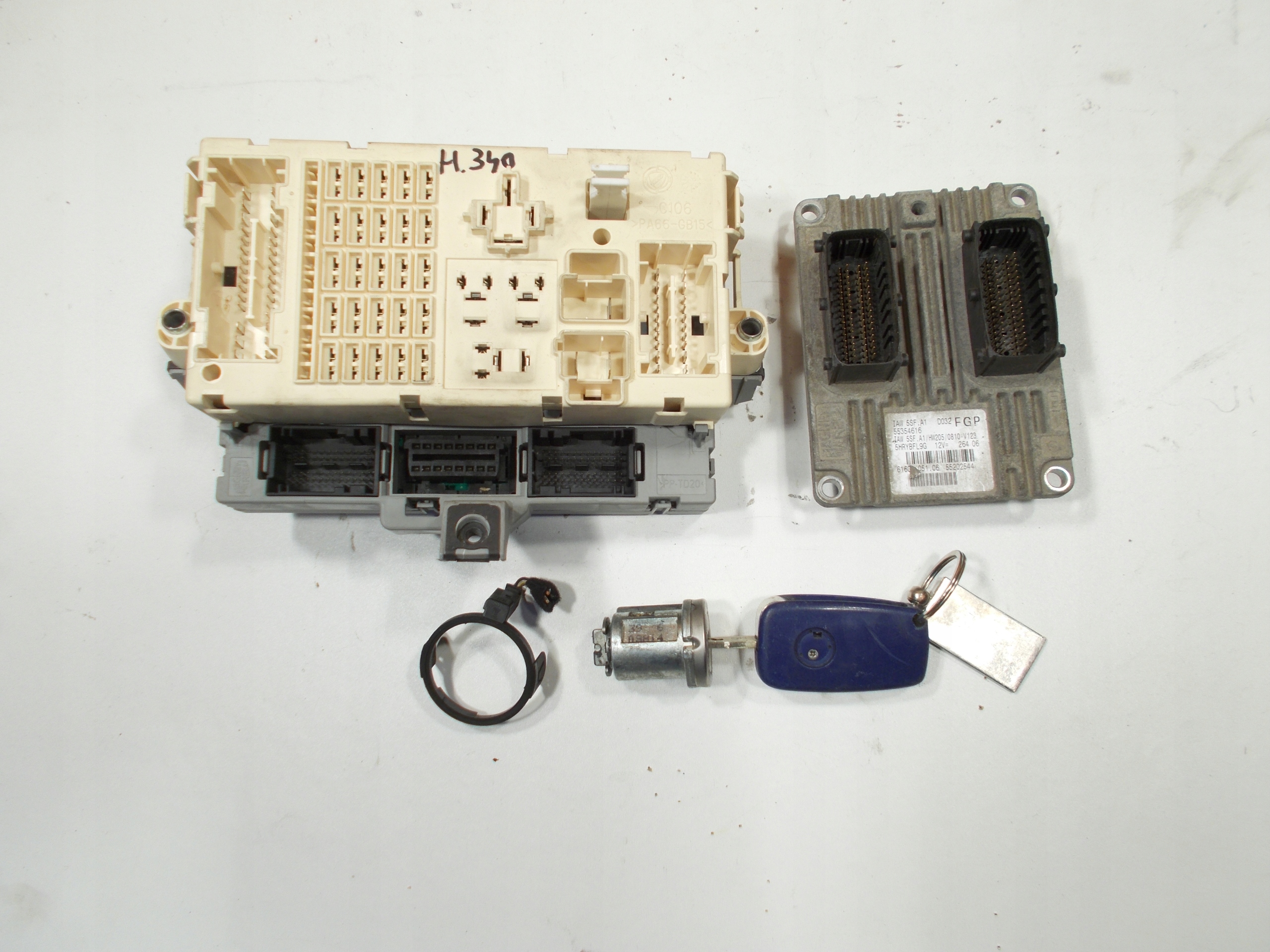 Używany sterownik/komputer ze skrzynką BSI, pętlą, stacyjką i kluczykiem do samochodu Fiat Stilo 1.6 16V. Zestaw gotowy do odpalenia auta.