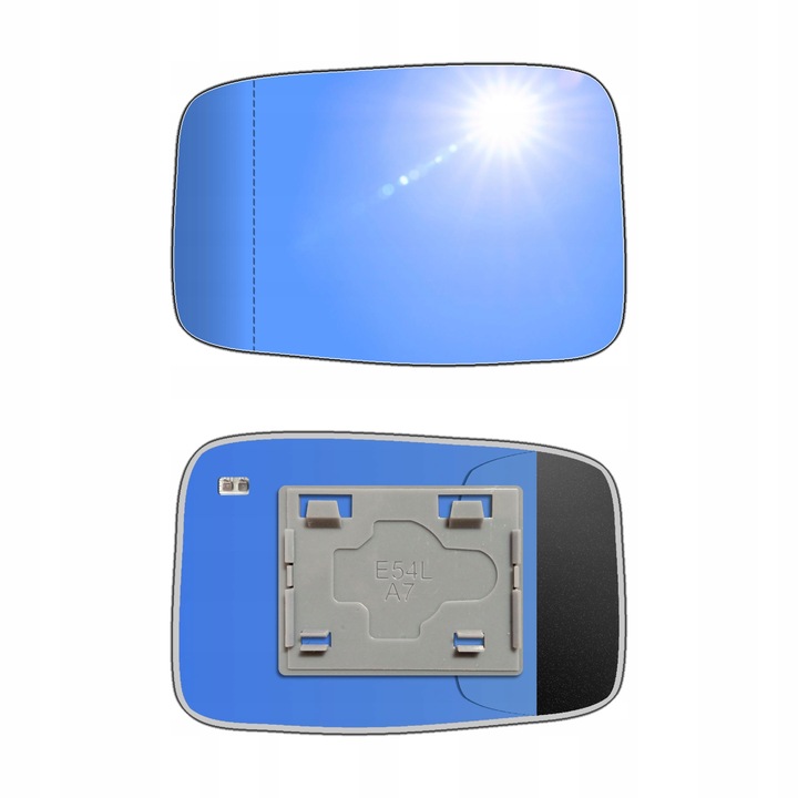 Antyrefleksyjny lewy ogrzewany wkład asferyczny lusterka - z plastikiem montażowym typu E54 i niebieskim oddalającym szkłem z grzałką