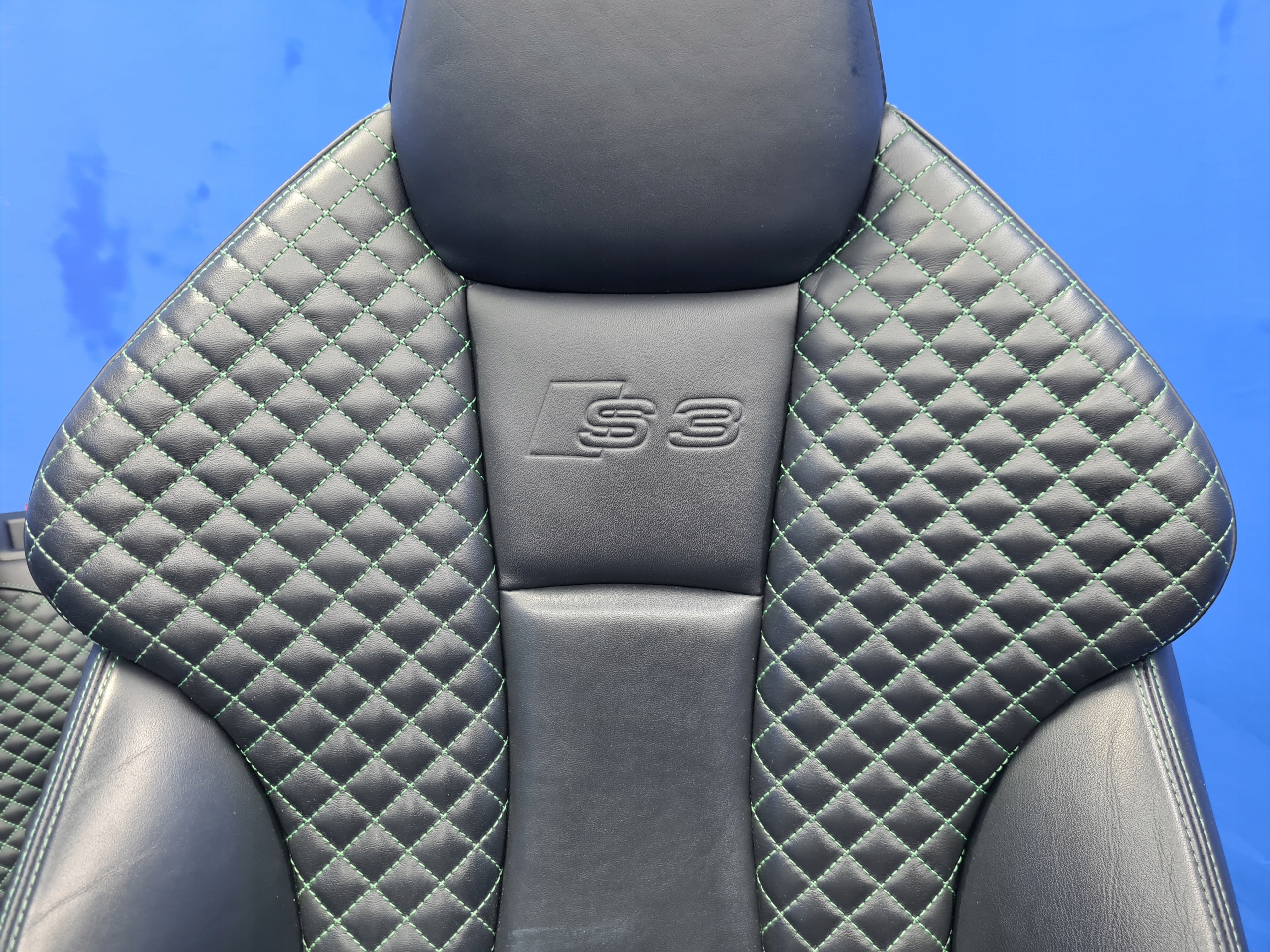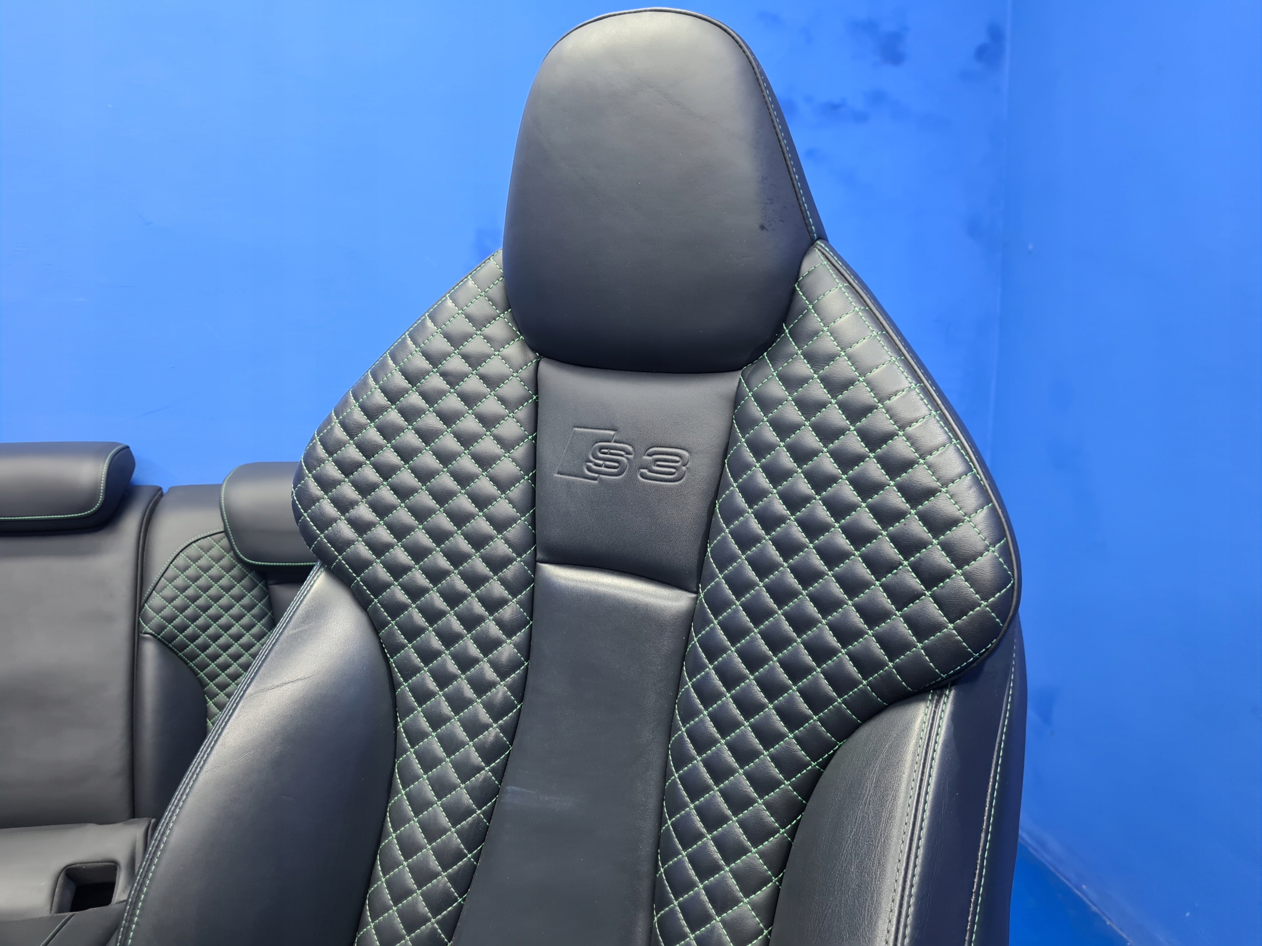 Przedmiotem sprzedaży jest oryginalny komplet FOTELI pikowanych ze zintergowanym zagłówiem oraz z akcentami zielonej nici do samochodu AUDI A3 S-LINE / S3 8V SPORTBACK