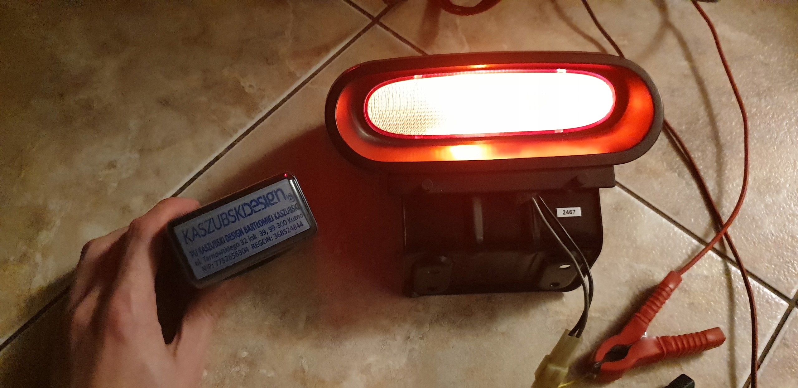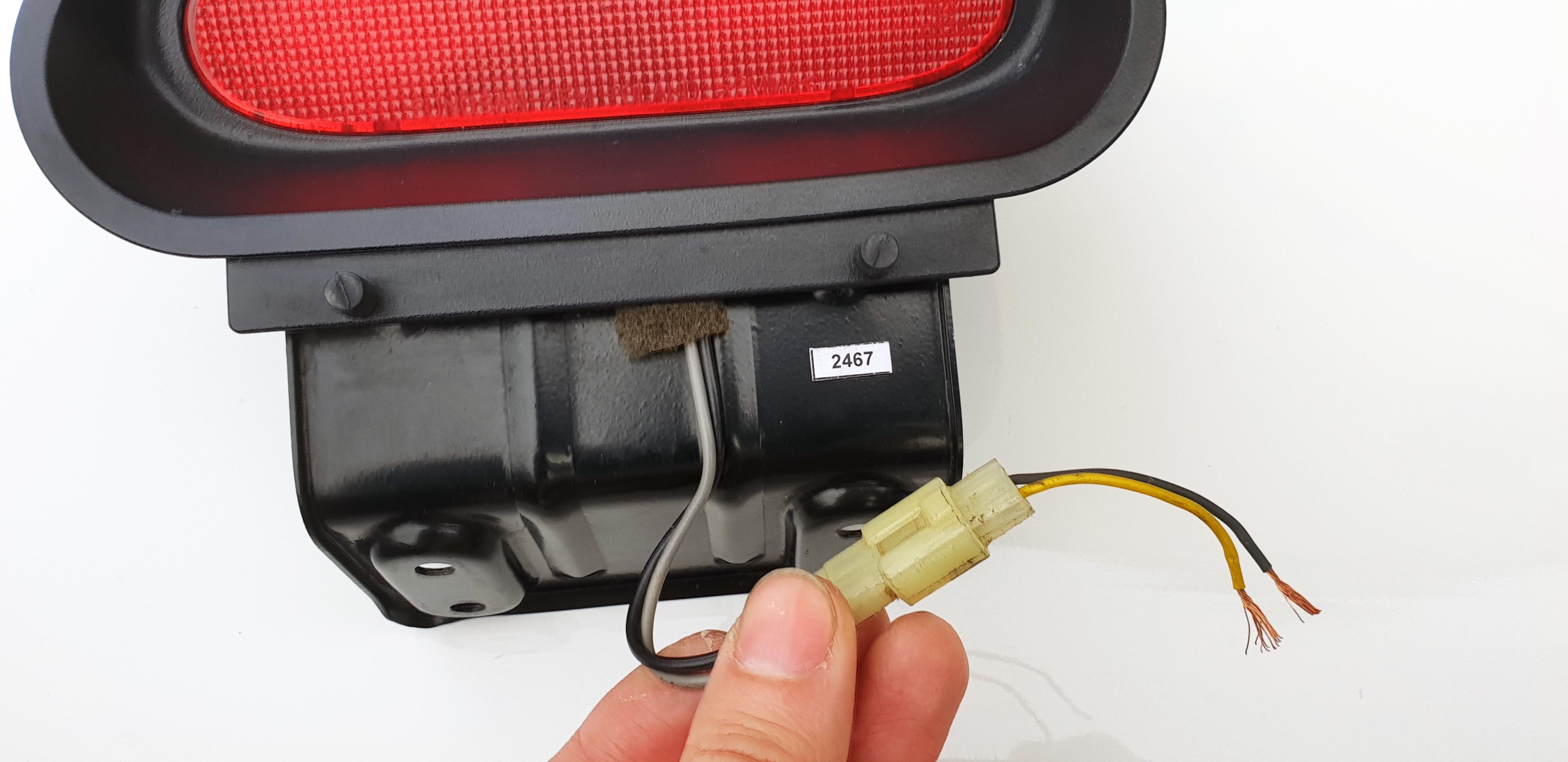 Technicznie, pod względem "świecenia", światło stop w 100% sprawne - było sprawdzane "na krótko", można sobie zobaczyć na jednym zdjęciu, że wszystko ładnie świeci. Jeżeli chodzi o sam stan światła: czerwony klosz cały, ładny, bez pęknięć. Obudowa, co ciekawe, również cała - rzadko spotyka się całą, na ogół jest popękana. Jak widać ze światłem stop jest również bardzo malutki kawałeczek kabelka/wtyczki instalacji - zostawiam, pewnie się nie przyda, ale... a może będzie potrzebne. Jak widać całość oryginalna.