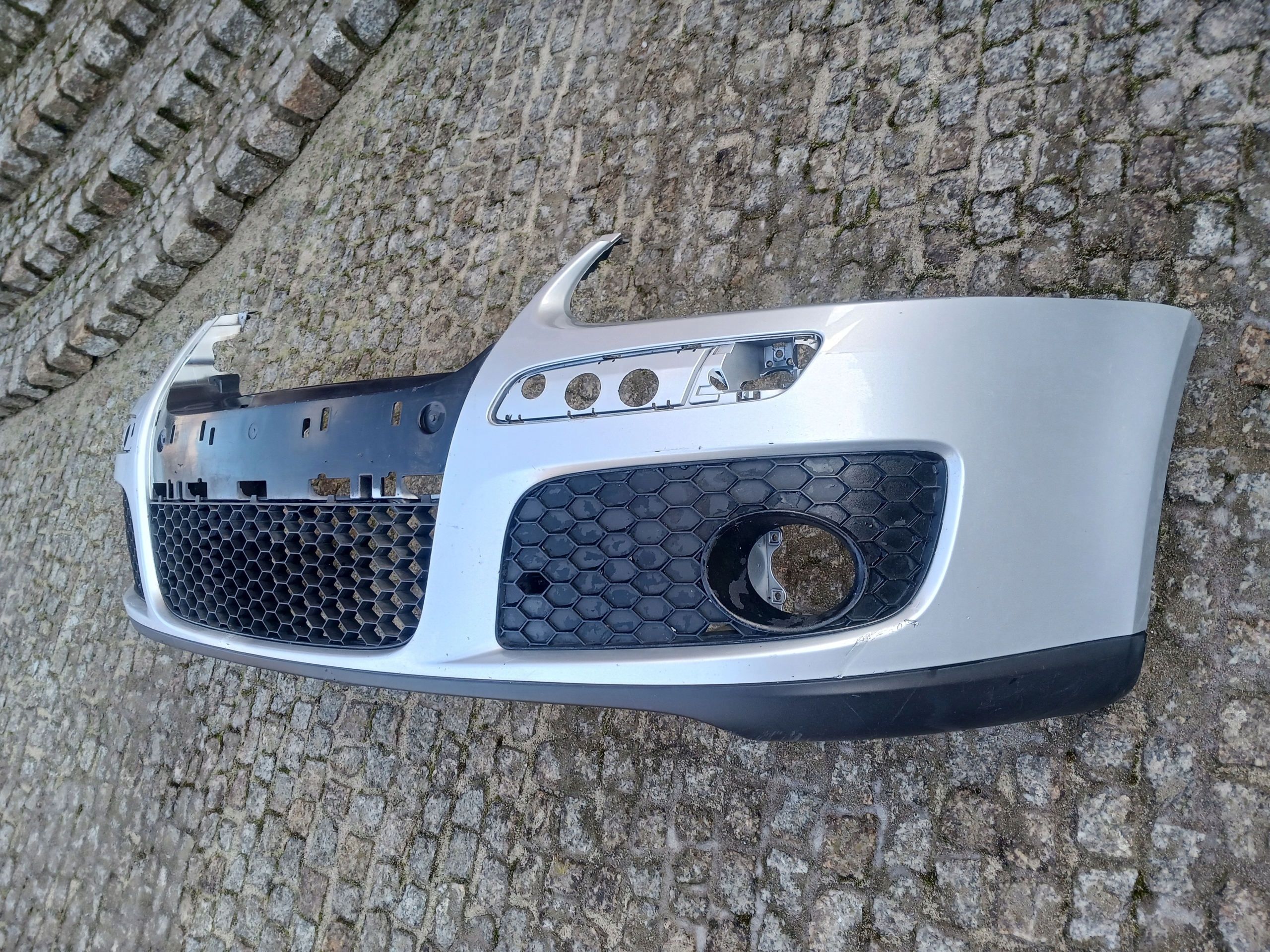Oryginalny przedni zderzak do Volkswagena Golfa 5 GTI w ładnym stanie, cały kompletny jak na zdjęciu, troche podrapany od dołu. Komplet z kratkami.