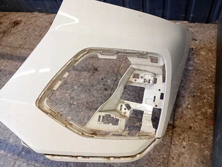 Zderzak oryginalny, konstrukcyjnie niekompletnie uszkodzony – pęknięty w dwóch miejscach (pęknięcia widoczne na zdjęciach), powierzchnia porysowana. Mocowania częściowo całe, niektóre zaczepy mogą wymagać naprawy lub wzmocnienia. Nadaje się do regeneracji blacharsko-lakierniczej.