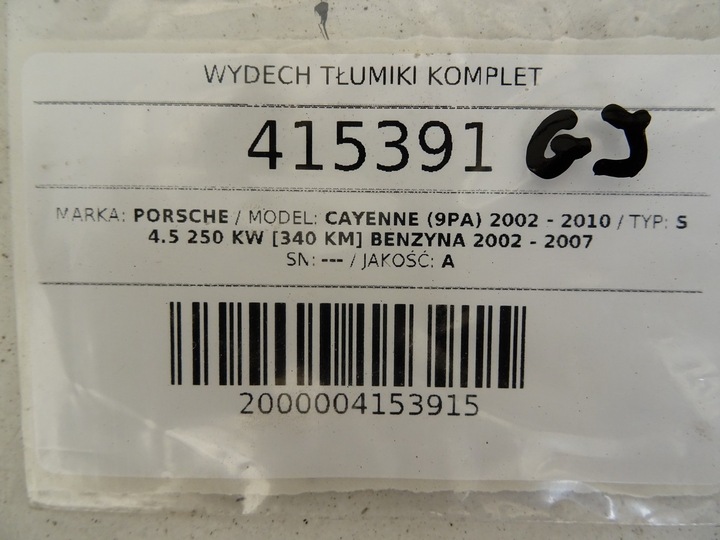 JAKOŚĆ A • SILNIK: 4.5B V8 250kW (340KM) M48.00 • VIN: WP12229PZ5LA44358 • SKRZYNIA AUTOMATYCZNA • KOLOR SAMOCHODU: BIAŁY • SUV • ROK PRODUKCJI: 2004 • OKRES PRODUKCJI: 2002-2010 • TŁUMIK WYDECHOWY PORSCHE CAYENNE 4.5 340KM 02-10