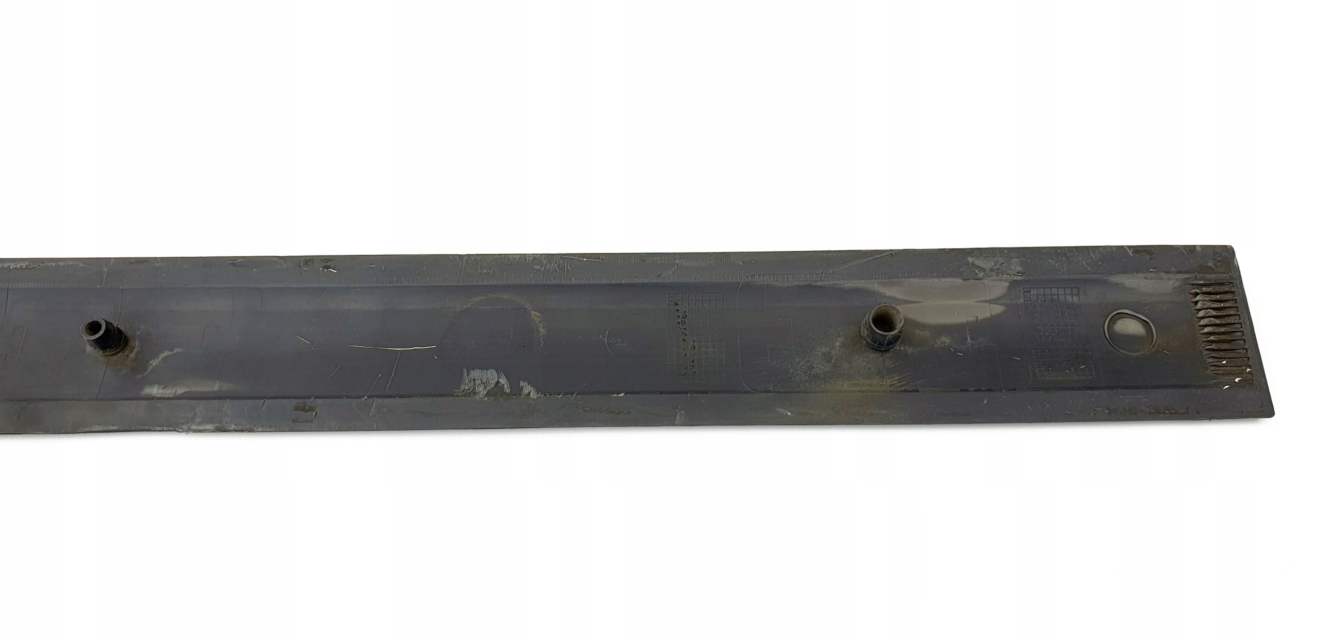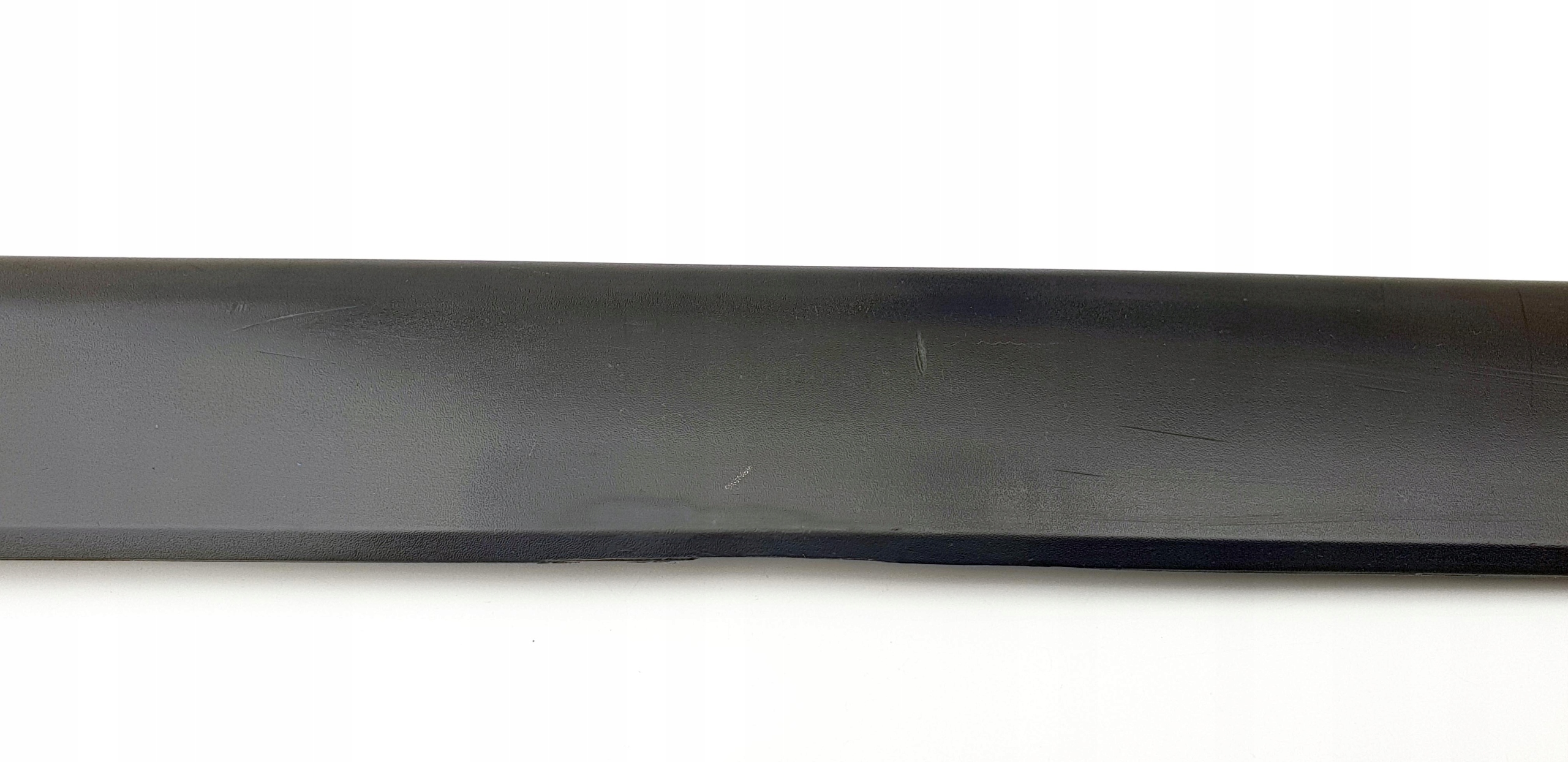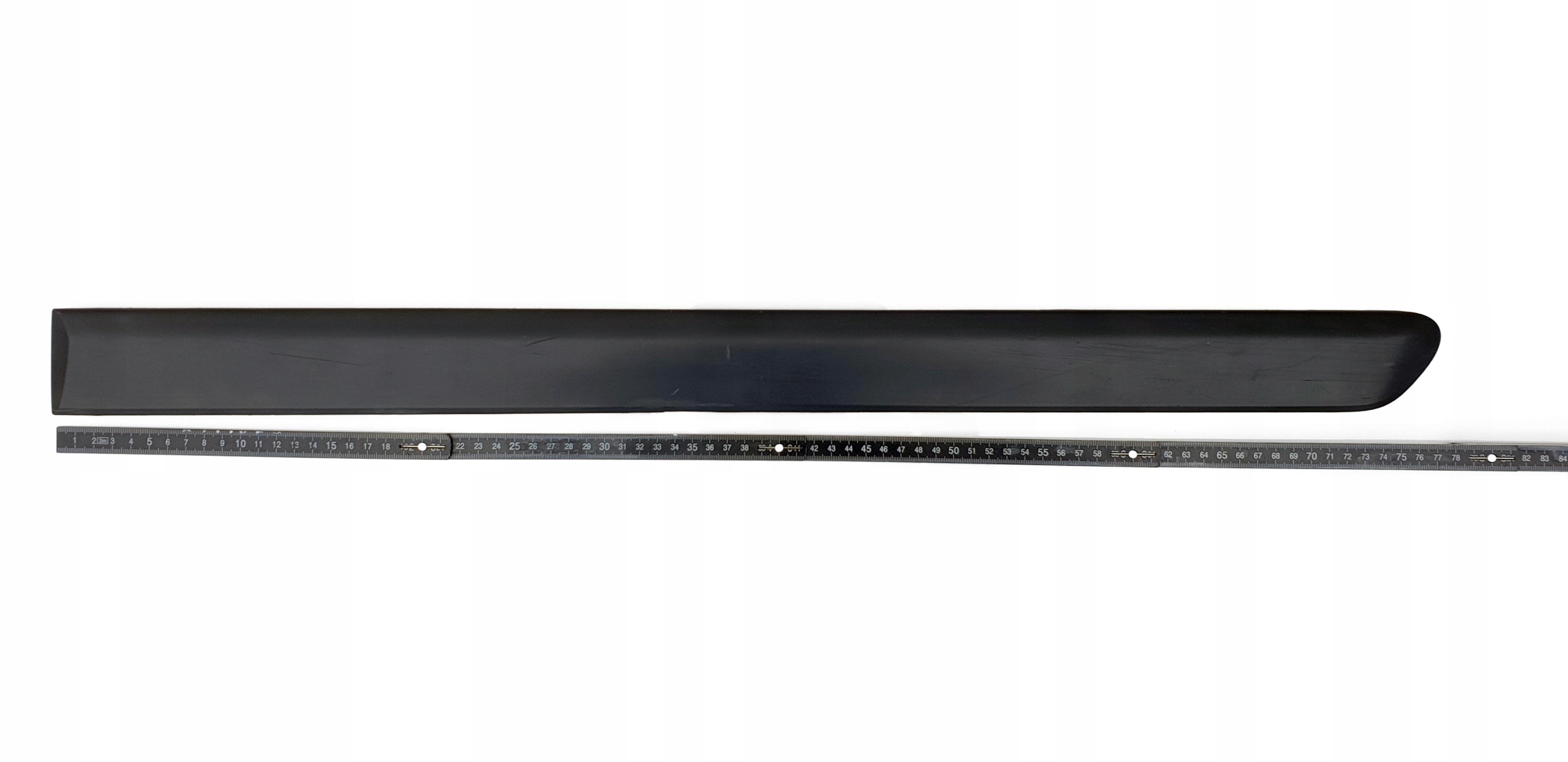 Wizualnie taka sobie. Są oczywiście jakieś ryski (są takie dłuższe nawet, widać to na jednym ze zdjęć), znajdą się również małe obicia jak przystało na element, który mam za zadanie ochraniać drzwi. Technicznie "mocowania", jeżeli można tak nazwać bolczyki, które wchodzą w dziury drzwi, aby chyba tylko po to, żeby idealnie je zamontować, są dwa całe, a jedno jest uszkodzone, tzn. jest chyba ścięte - to i tak nie odegra za dużej roli przy montażu, ale uczciwie opisuję, że taki "defekt" jest. Listewka jak widać fabrycznie montowana jest na taśmę dwustronną - przed montażem należy ją usunąć i zastąpić nową, ewentualnie przykleić na jakiś klej. Listewka oryginalna, na jednym ze zdjęć widać numery katalogowe. Na ostatnim zdjęciu są przybliżone wymiary listewki - można jeszcze sprawdzić czy na pewno poszukują Państwo takiej, o takiej długości.