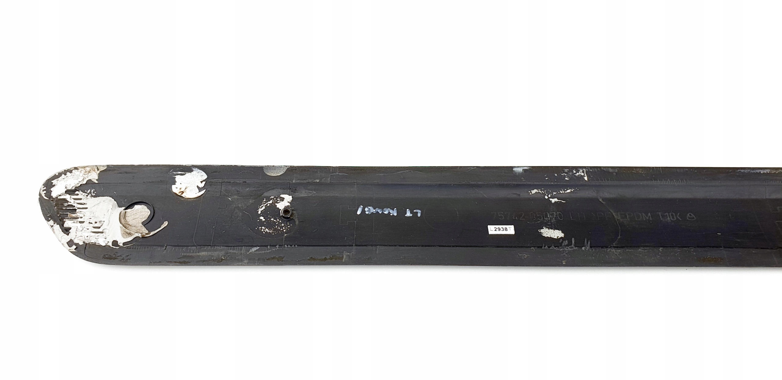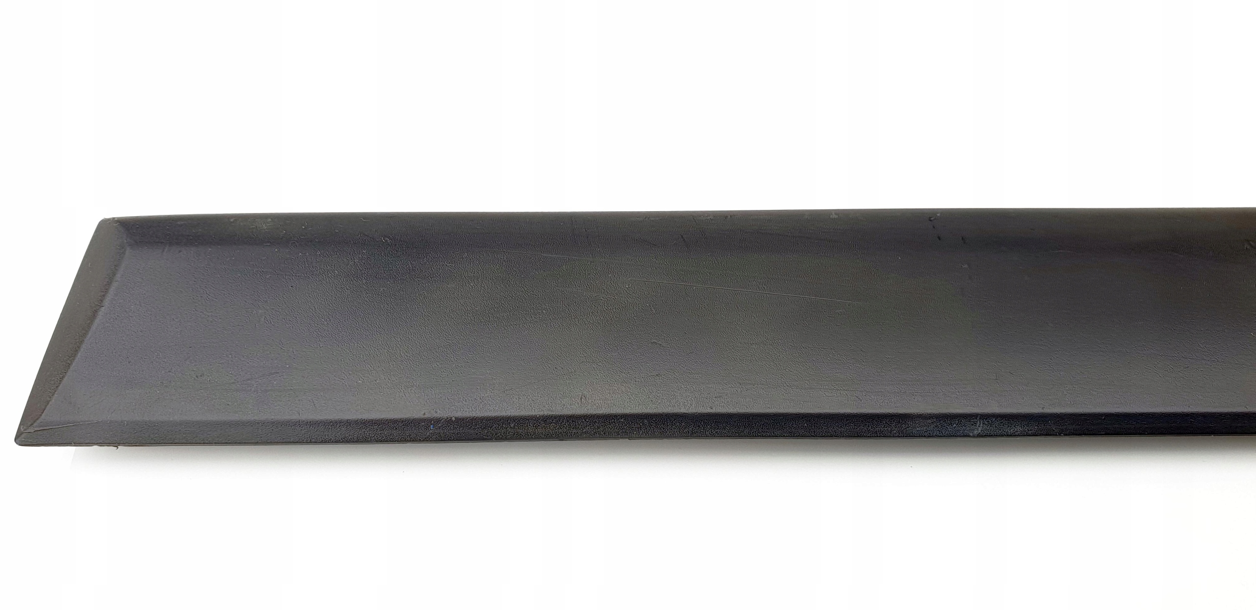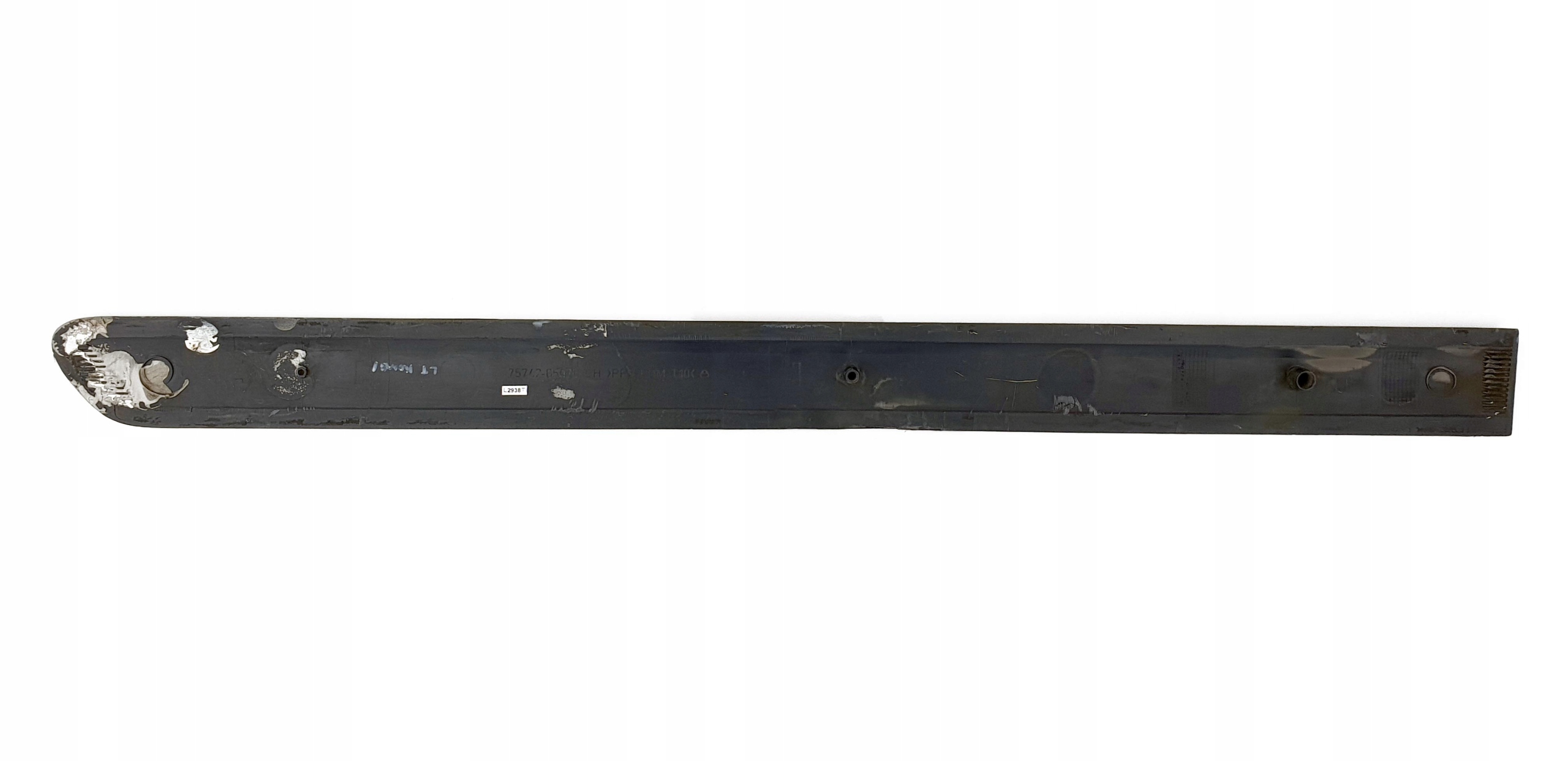 Wizualnie taka sobie. Są oczywiście jakieś ryski (są takie dłuższe nawet, widać to na jednym ze zdjęć), znajdą się również małe obicia jak przystało na element, który mam za zadanie ochraniać drzwi. Technicznie "mocowania", jeżeli można tak nazwać bolczyki, które wchodzą w dziury drzwi, aby chyba tylko po to, żeby idealnie je zamontować, są dwa całe, a jedno jest uszkodzone, tzn. jest chyba ścięte - to i tak nie odegra za dużej roli przy montażu, ale uczciwie opisuję, że taki "defekt" jest. Listewka jak widać fabrycznie montowana jest na taśmę dwustronną - przed montażem należy ją usunąć i zastąpić nową, ewentualnie przykleić na jakiś klej. Listewka oryginalna, na jednym ze zdjęć widać numery katalogowe. Na ostatnim zdjęciu są przybliżone wymiary listewki - można jeszcze sprawdzić czy na pewno poszukują Państwo takiej, o takiej długości.