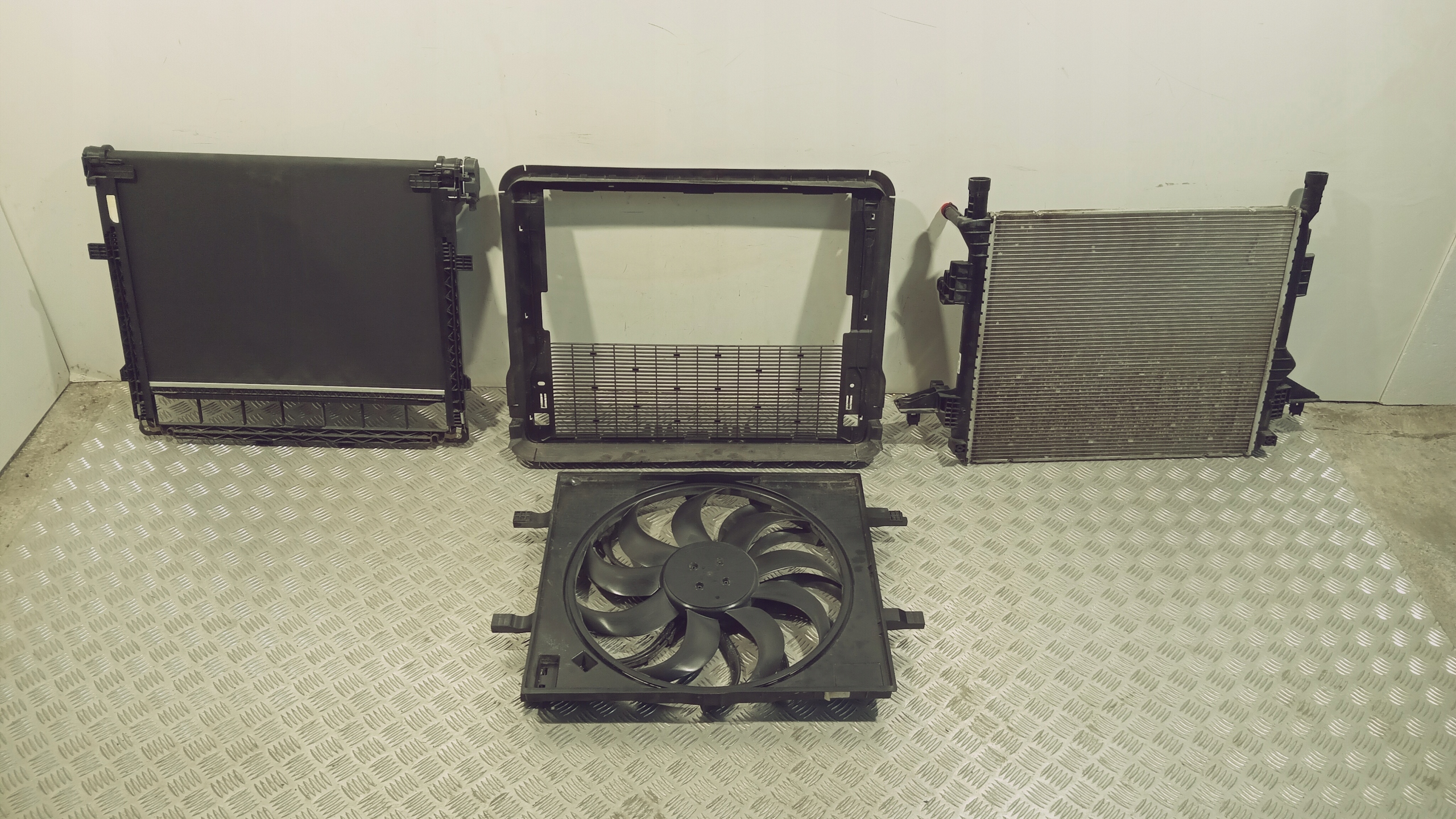 ORYGINALNY KOMPLET CHŁODNICA WODY , WENTYLATOR , ŻALUZJA-ROLETA I RAMKA WIDOCZNY NA ZDJĘCIU VW ID.3 , ID.4 , ID.5 , AUDI Q4 , SKODA ENYAQ iV ITP NR 1EA121251B , 1EA121205A , 1EA122135E , 1EA959455C , 1EA121203C , 1EA965501A , 1EA121281C ROCZNIK 2019-2025.