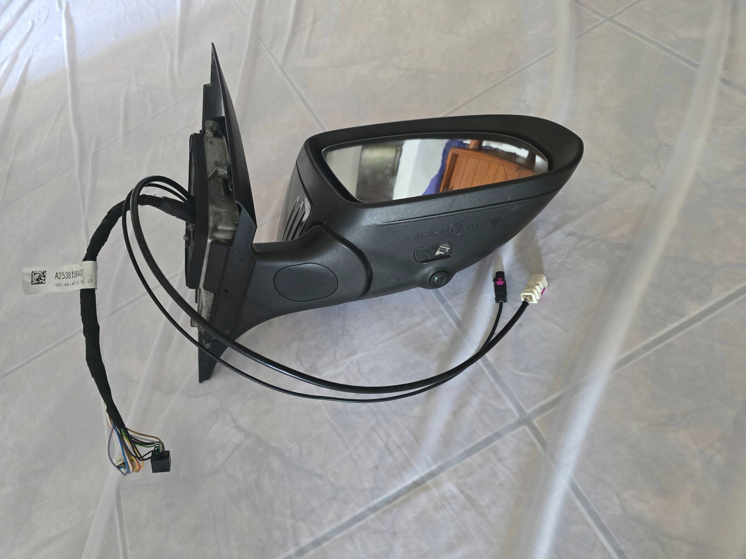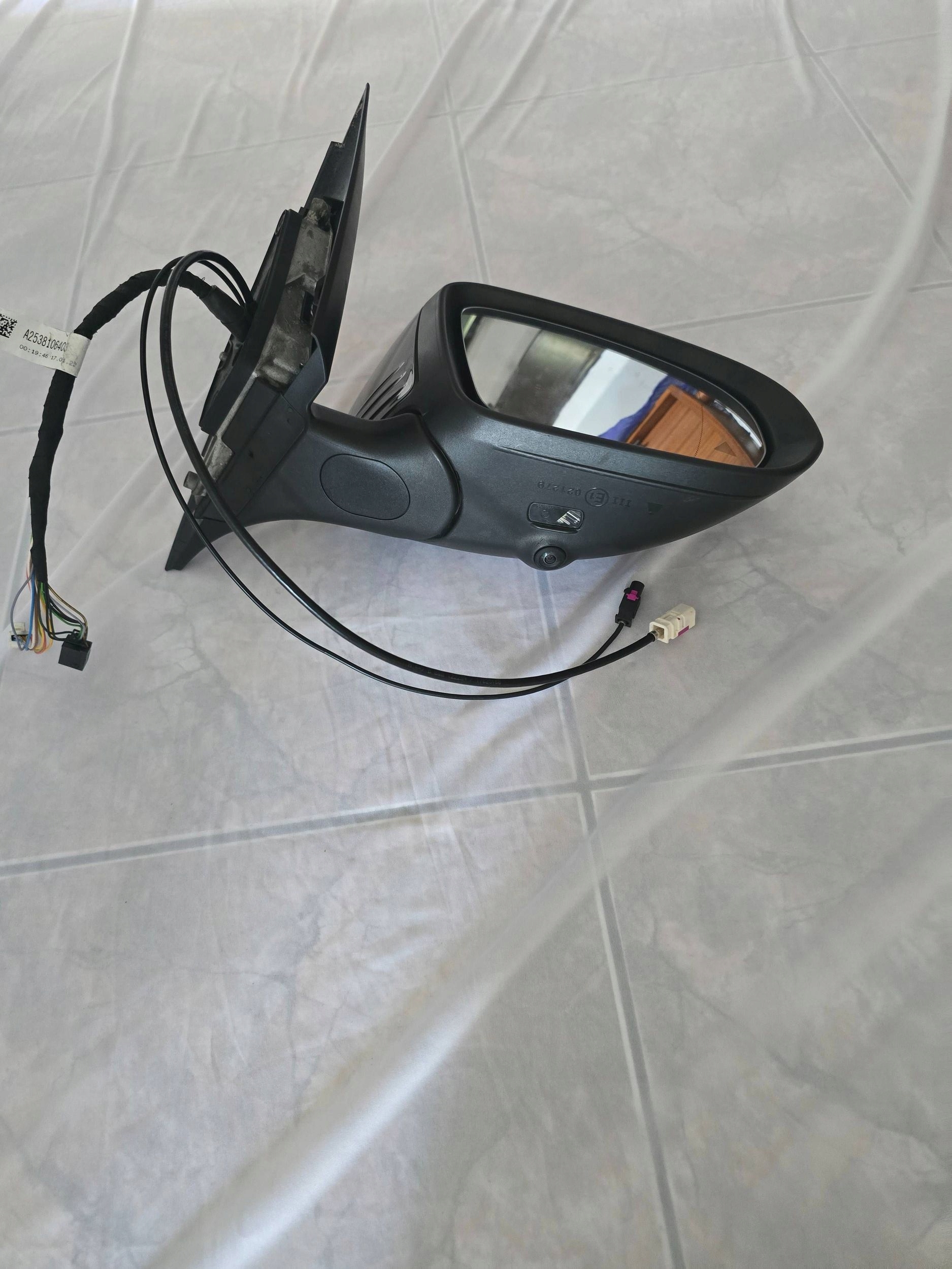 Mirror for Mercedes X253 W253 GLC 2015-2019 before facelift right side. Used, complete, functional mirror, European version. Mirror with lane change assistant with parking assistant (so-called camera) - electrically adjustable - heated (original mirror insert) - antenna - electrically folding - backlight - turn signal - memory - two connection cubes black for 8 wires white for 8 wires together a harness for 16 wires + camera cable + antenna cable. Camera number A205 905 35 09.Lusterko do mercedesa X253 W253 GLC 2015-2019 rok przed liftingiem prawa strona. Lusterko używane, kompletne, sprawne, wersja europejska. Lusterko z asystentem zmiany pasa ruchu z asystentem parkowania (tzw. kamera) -regulowane elektrycznie -podgrzewane (oryginalny wkład lustra) - antena -elektrycznie składane -podświetlenie -kierunkowskaz -pamięć -dwie kostki do podłączenia czarna na 8 przewodów biała na 8 przewody razem wiązka na 16 przewodów + przewód kamery + przewód anteny. Numerkamery A205 905 35 09.