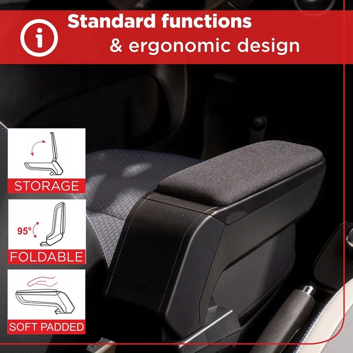 Górna część podłokietnika pokryta jest wysokiej jakości tkaniną, przyjemną w dotyku, odporną i dobrze komponującą się z wnętrzem większości samochodów.