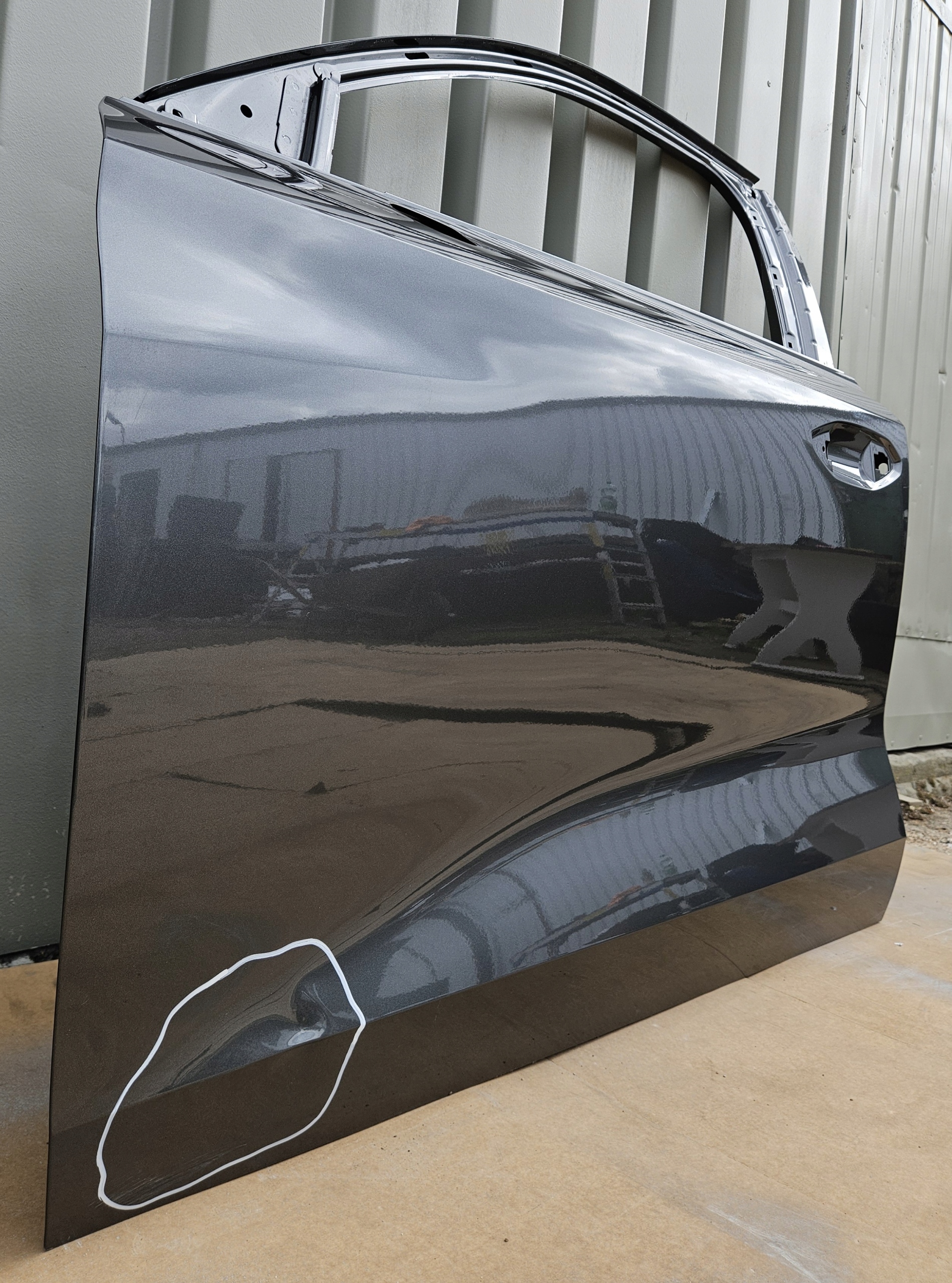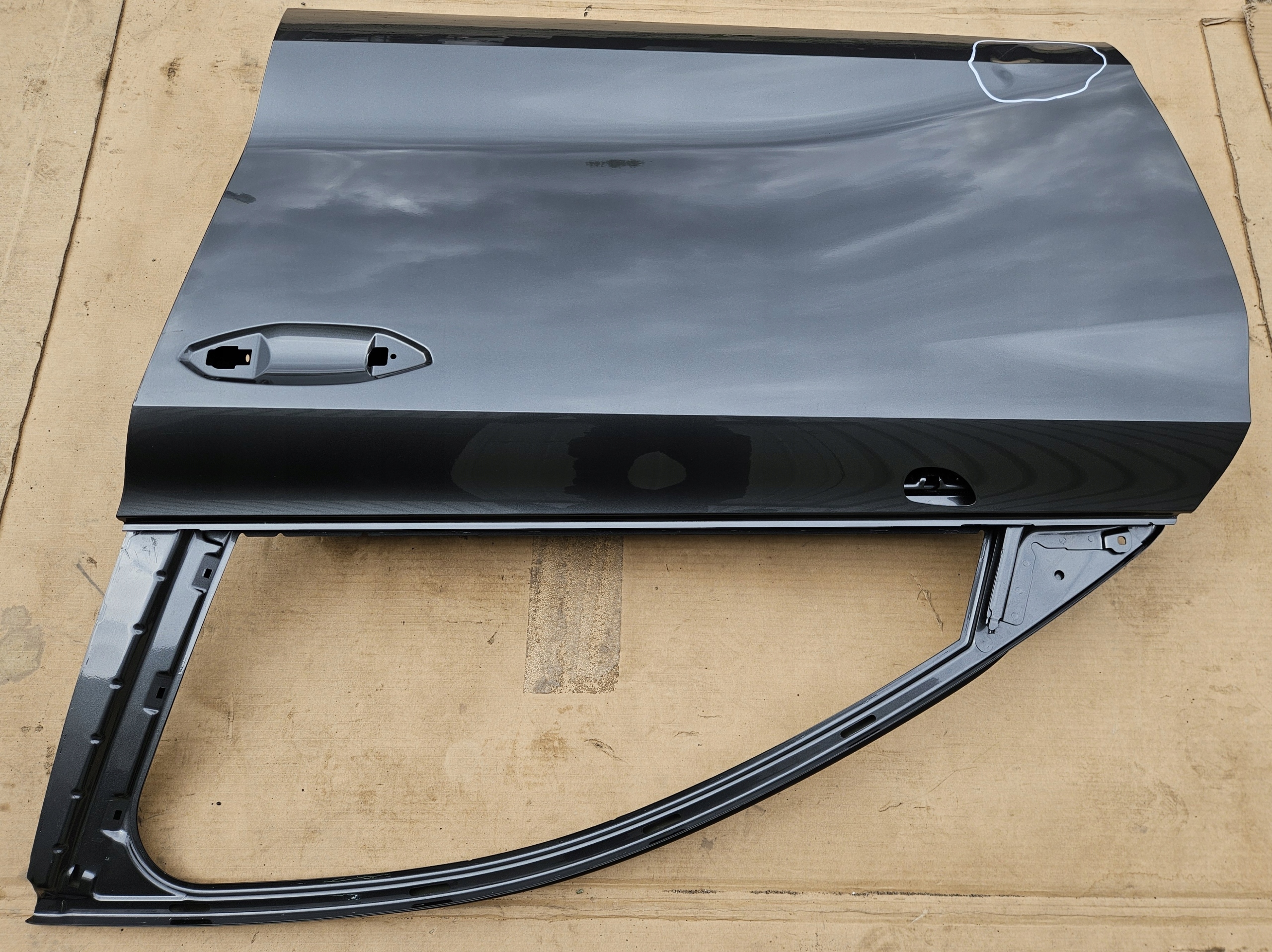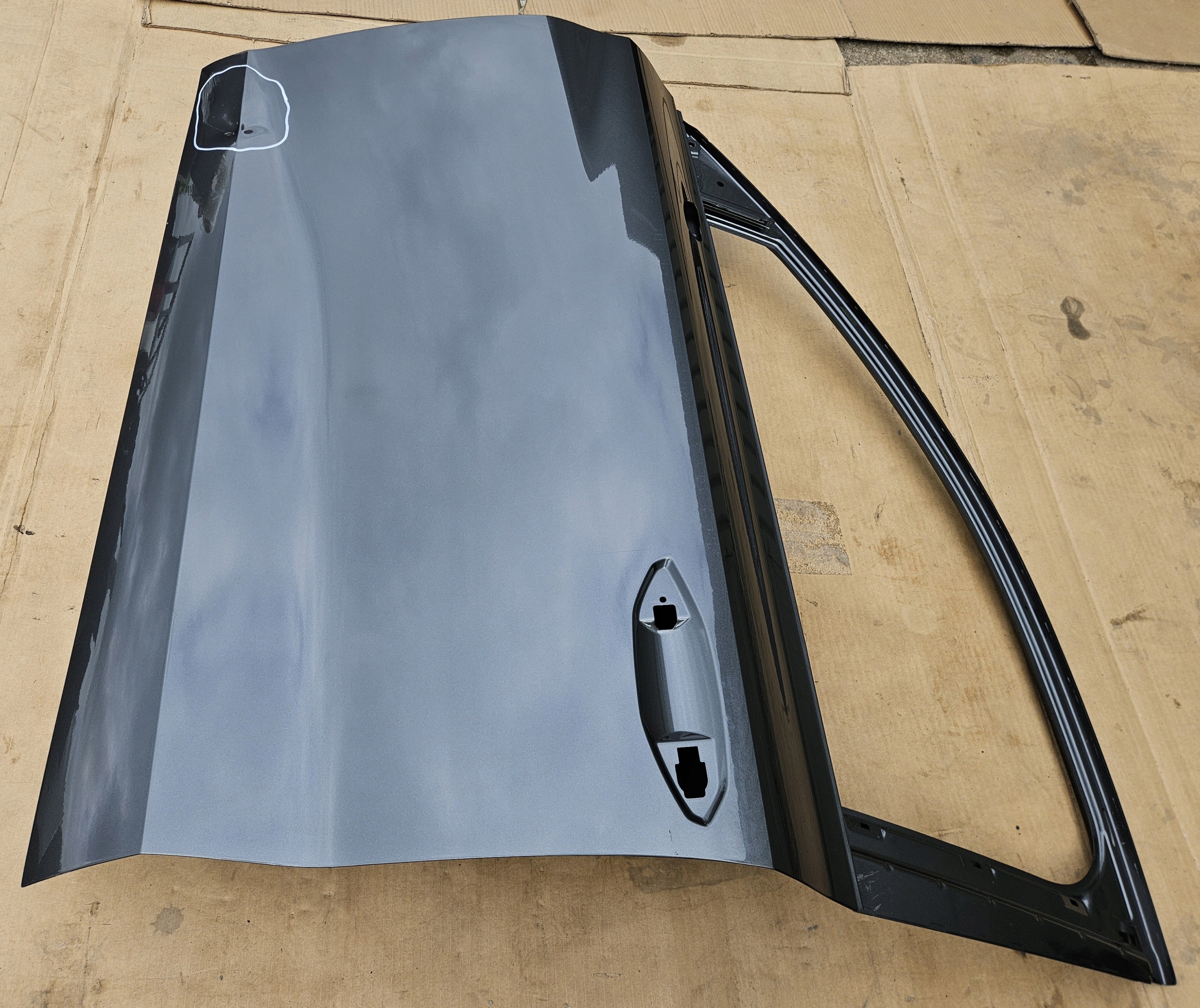 Stan uważam za bardzo dobry. Drzwi posiadają wgniecenie w zaznaczonym obszarze do bezproblemowego wyciągnięcia (przedstawione na zdjęciach).