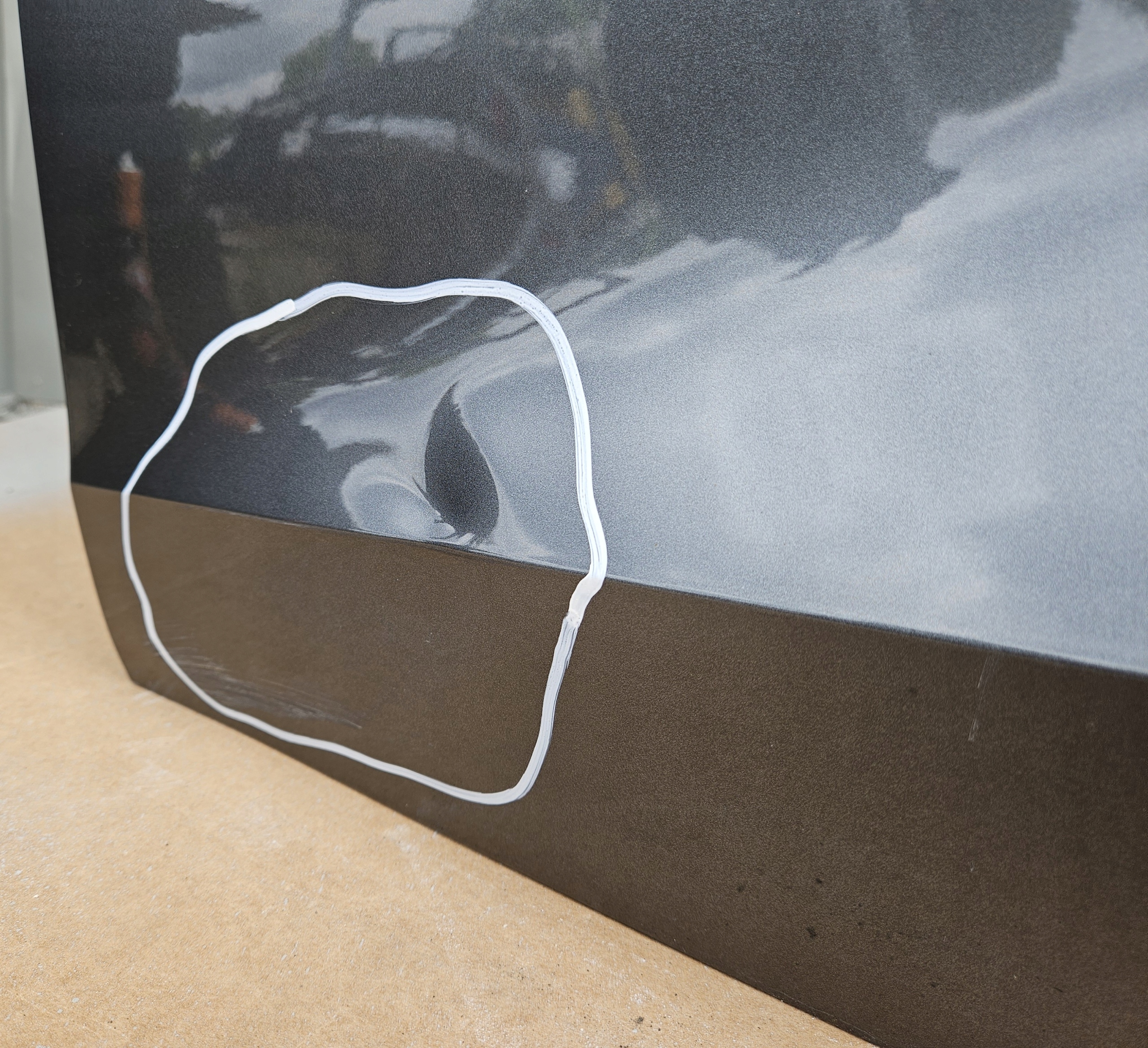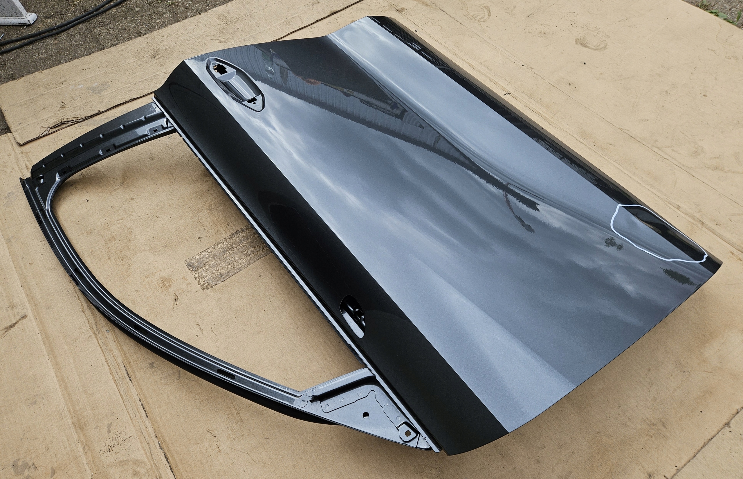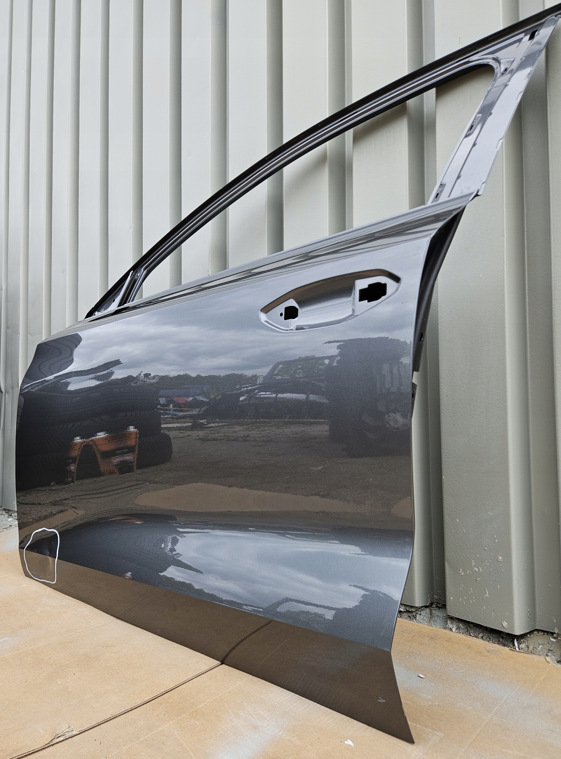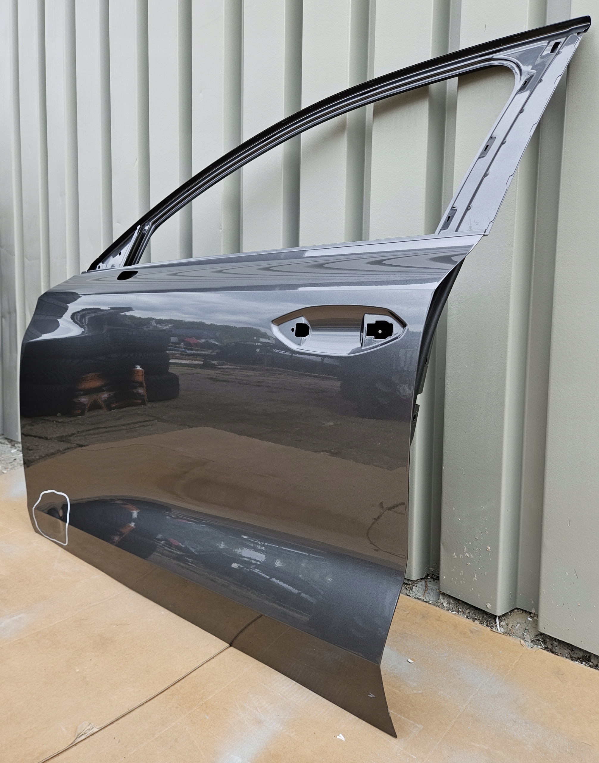 Stan uważam za bardzo dobry. Drzwi posiadają wgniecenie w zaznaczonym obszarze do bezproblemowego wyciągnięcia (przedstawione na zdjęciach).